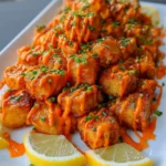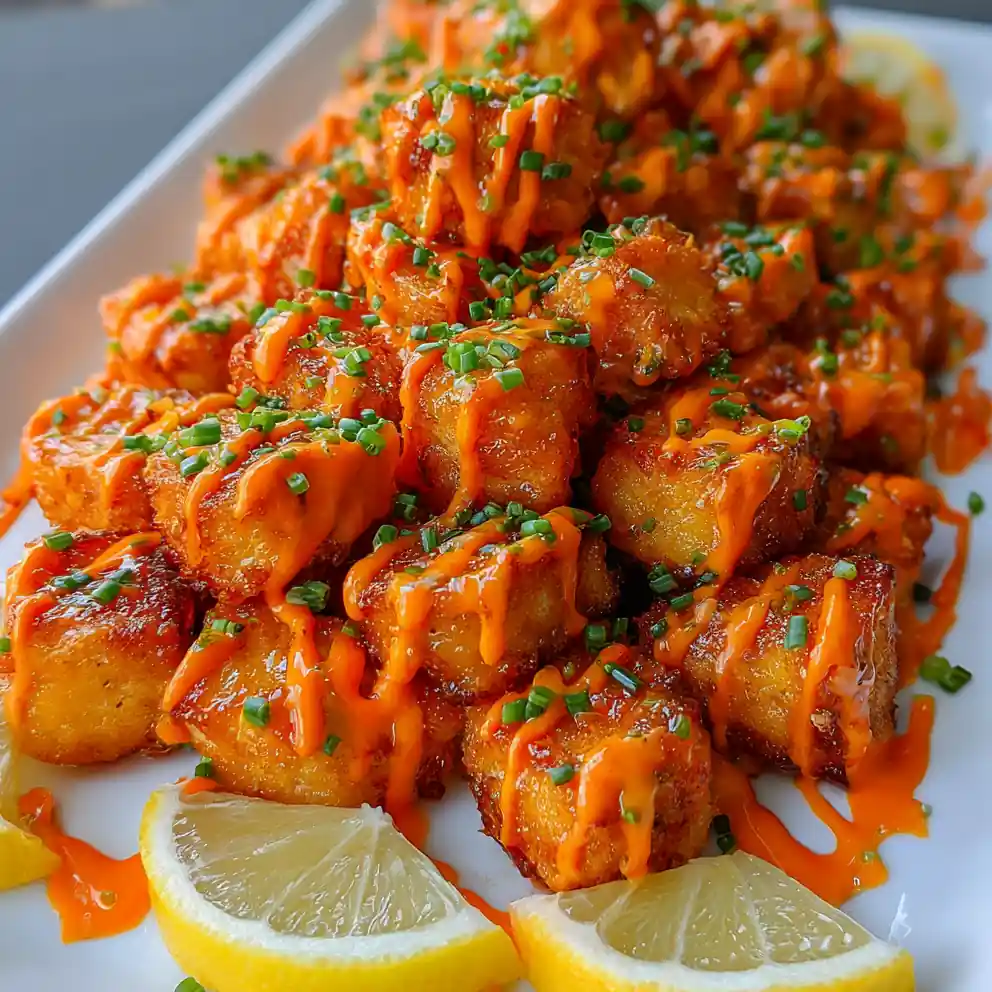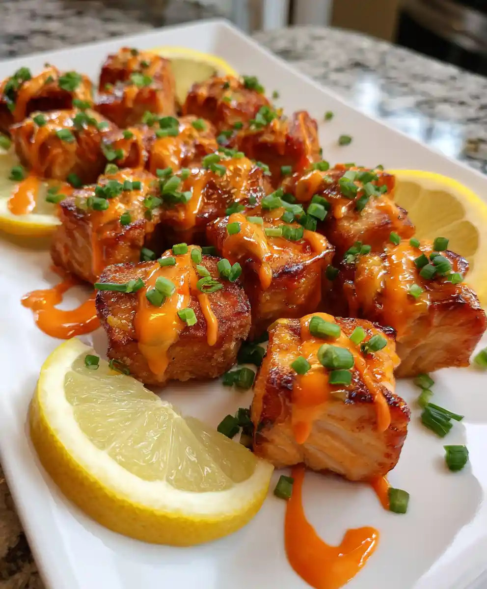 8. Plate and Garnish: Arrange the salmon bites on a white ceramic platter in a visually appealing manner. Drizzle the bang bang sauce over the top in a zig-zag pattern. Sprinkle generously with chopped chives and the remaining lemon zest. Place the lemon wedges opposite the sauce drizzle for a pop of color and added freshness.
