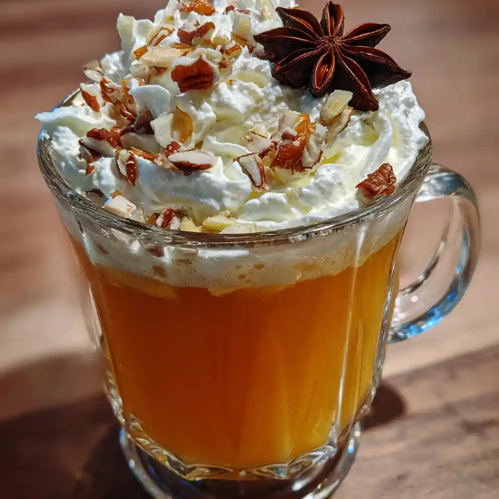 - Strain and Garnish: Strain the warm apple pie drink through a fine-mesh sieve into a heatproof pitcher or mugs, discarding all solids. Pour into mugs, dollop generous spoonfuls of fluffy coconut whipped cream on top. Sprinkle finely chopped toasted pecans and diced candied ginger over the cream, then place one whole star anise pod on each drink for garnish.