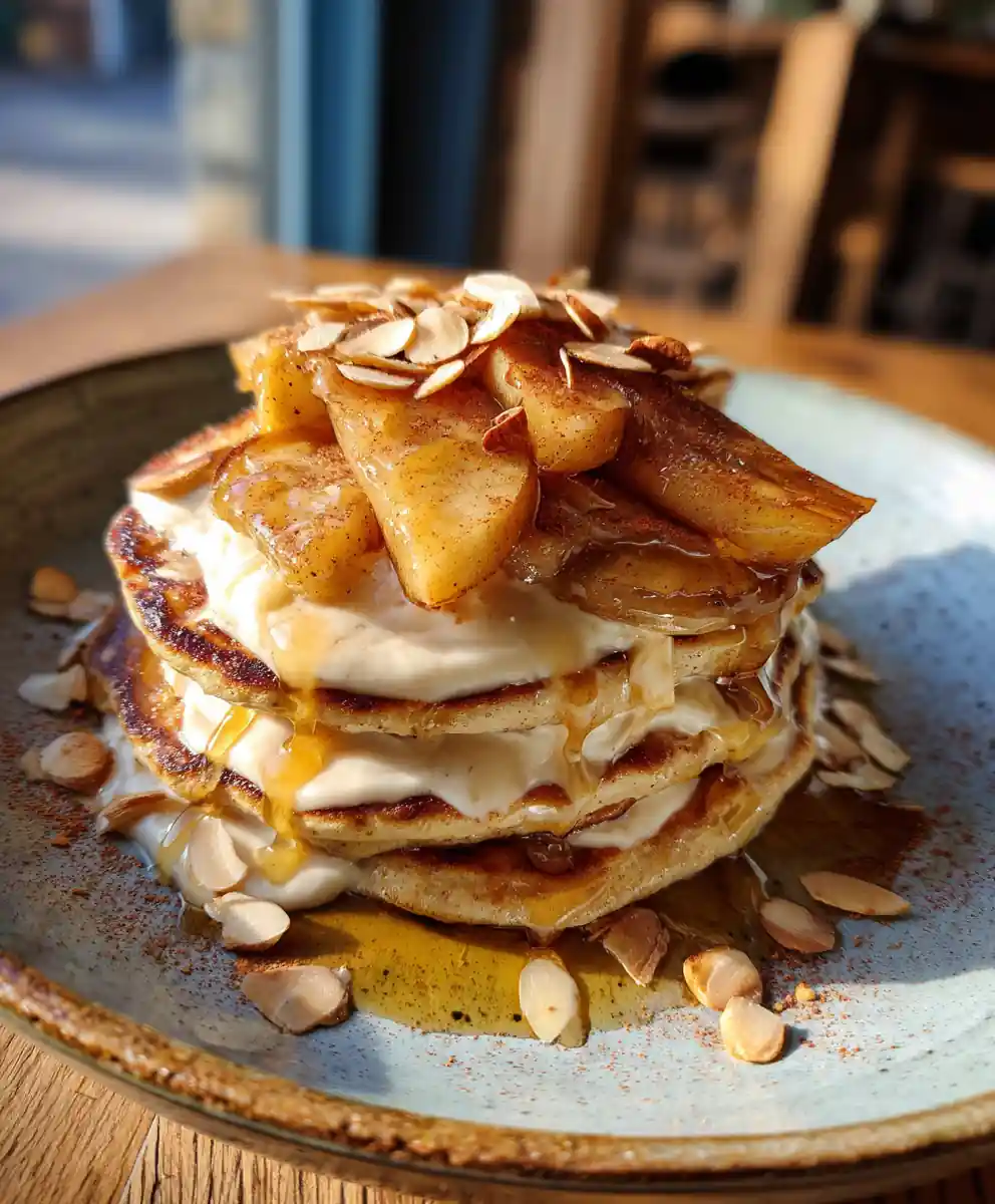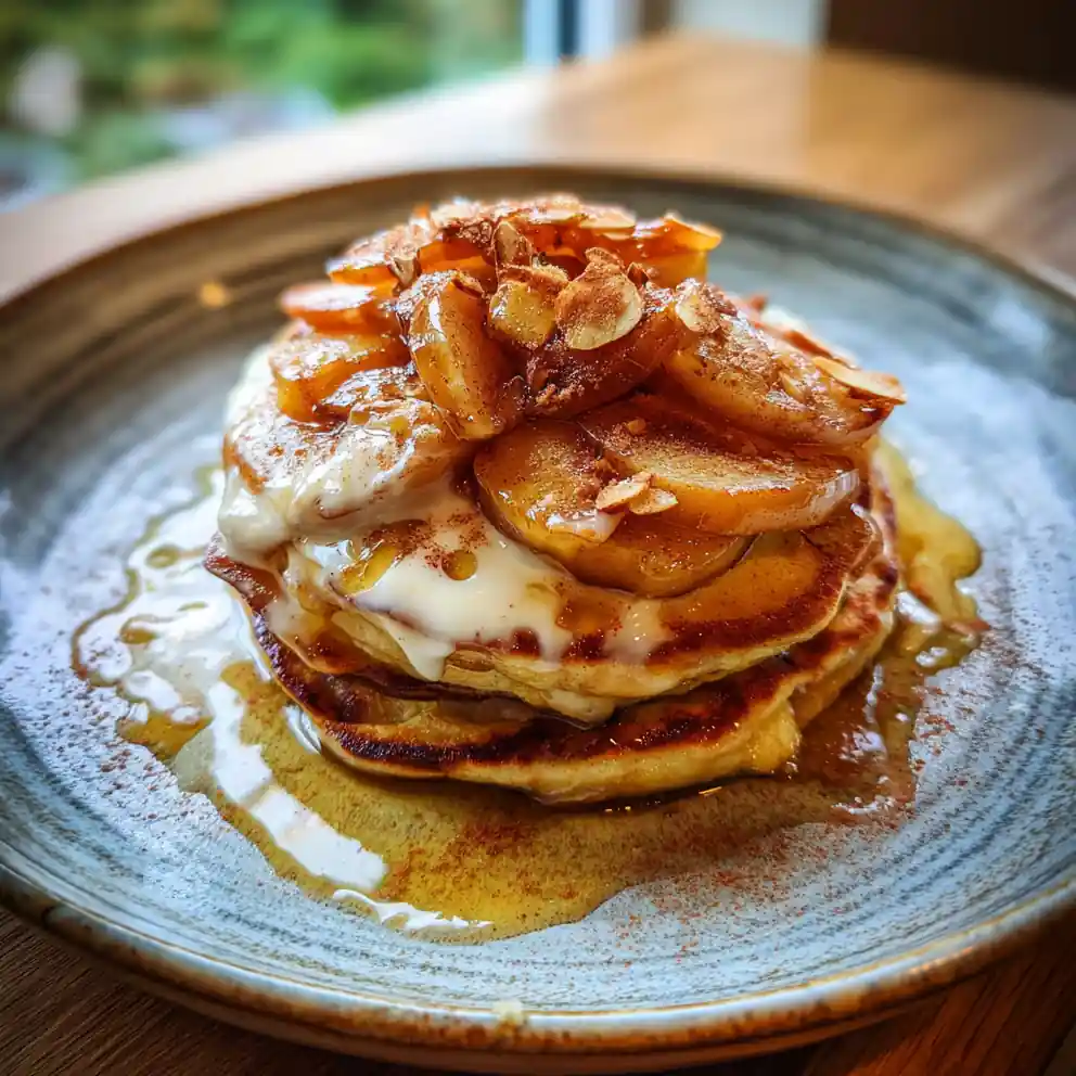 - Plate and Garnish: Stack three pancakes on a warm plate. Drizzle the caramelized apple pieces over the top. Drizzle any remaining cinnamon yogurt swirl around the stack. Dust lightly with ground cinnamon and scatter toasted almond slivers for added crunch and visual appeal.