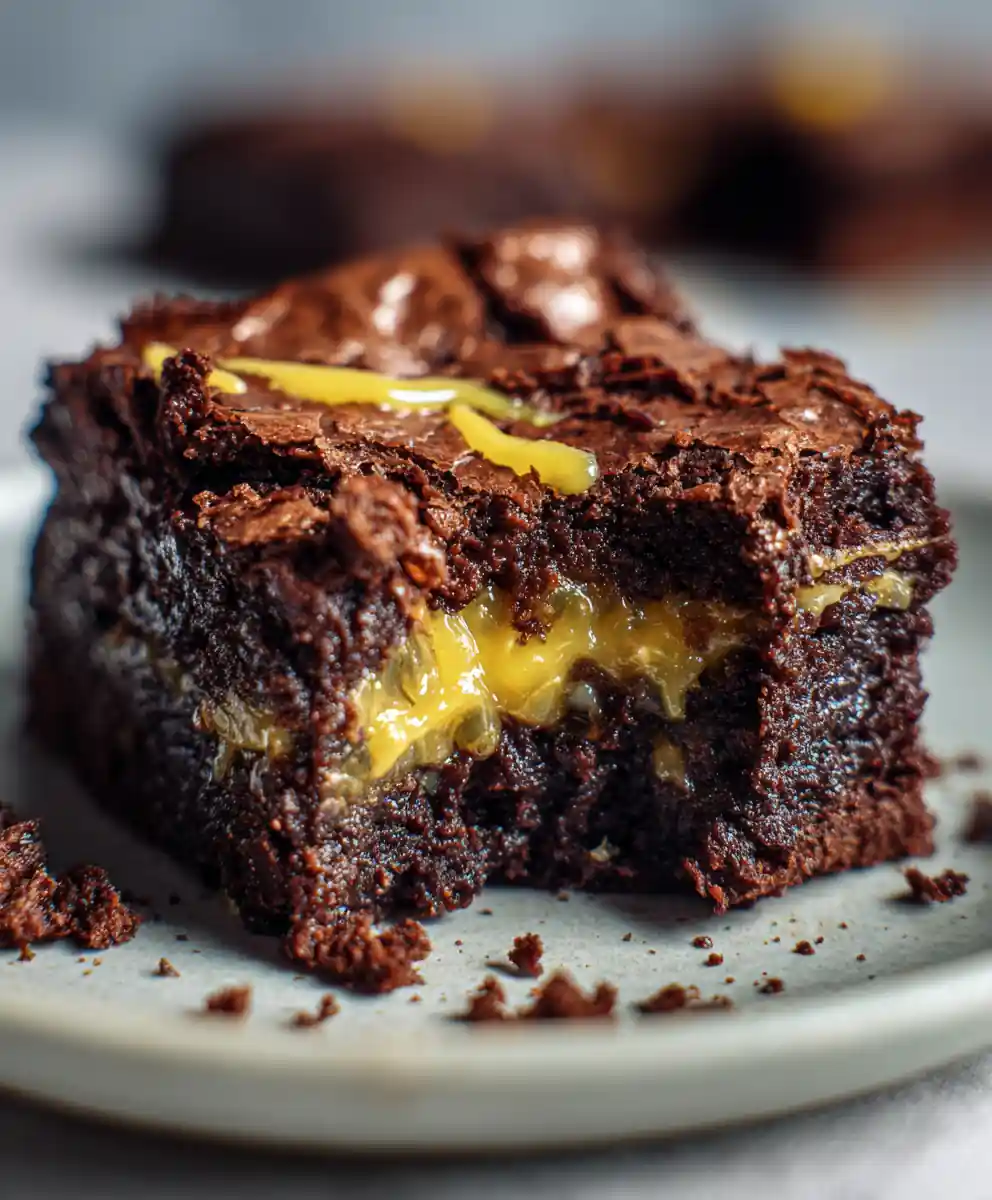 Rich and fudgy brownies made with healthy avocado instead of butter, featuring a vibrant, tangy ribbon of passionfruit curd swirled throughout. This healthier twist on a classic dessert offers an impressive gourmet flavor.
