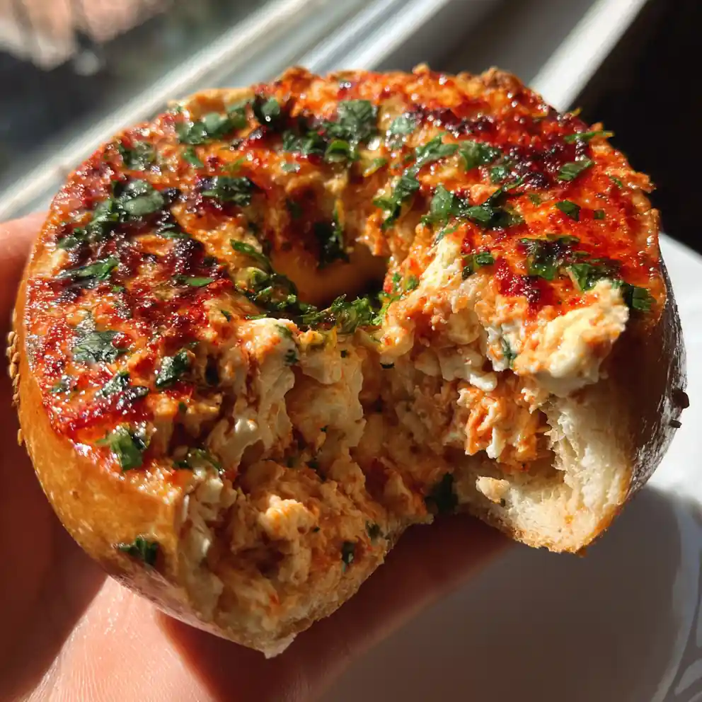 - Garnish and serve warm: Let the baked bagels cool on a wire rack for at least 10 minutes before slicing. Serve the bagels warm. For presentation, slice each bagel in half, arrange on a plate, drizzle with olive oil, and sprinkle generously with fresh chopped parsley over the filling for a fresh, aromatic finish to this high-protein bagel recipe with greek yogurt.