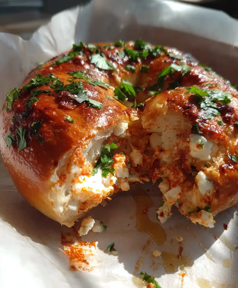 A high-protein bagel recipe made with a shortcut Greek yogurt dough, filled with roasted red peppers and feta cheese, ready in under 40 minutes.