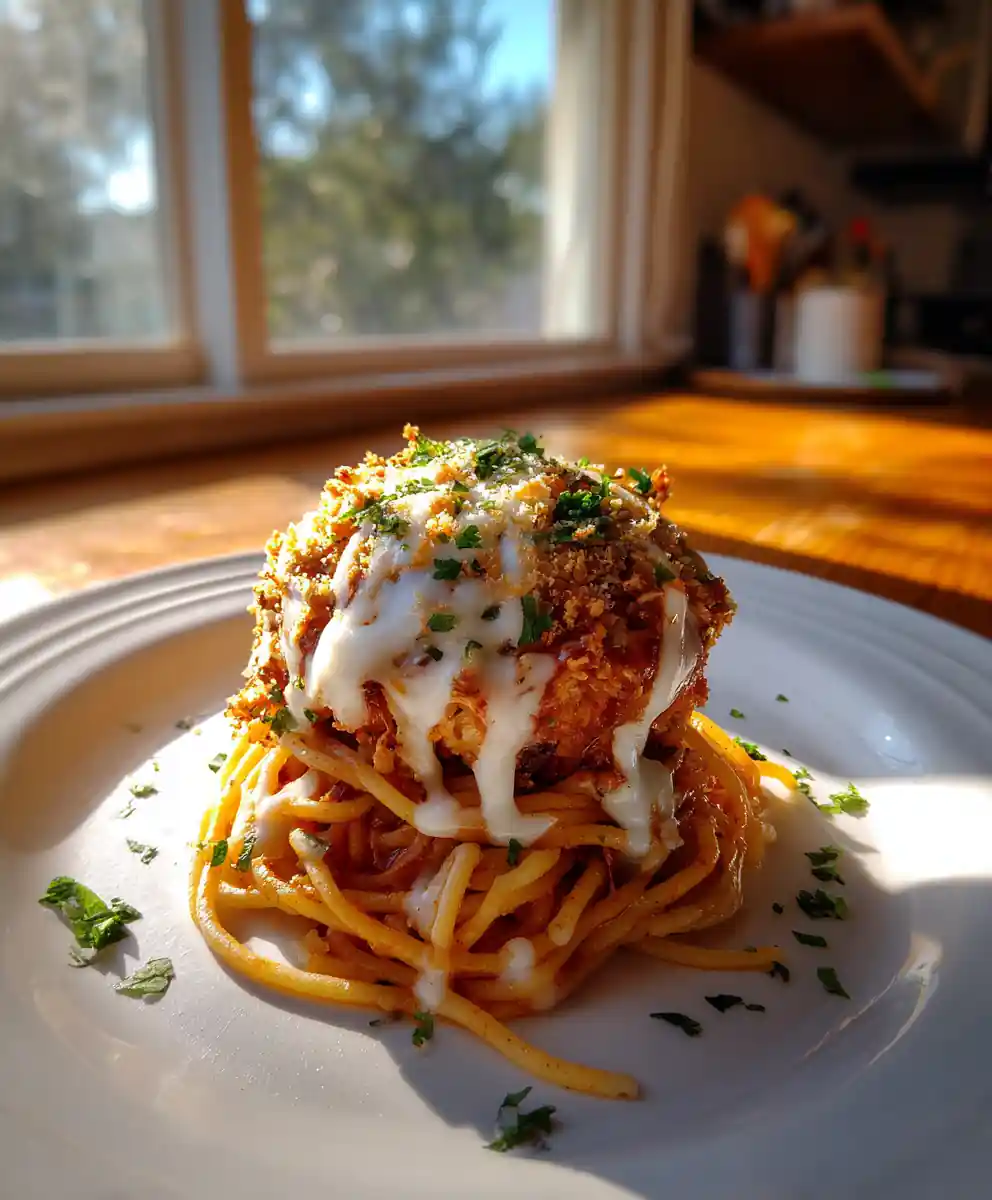 11. Rest & Serve: Let the casserole rest for 5 minutes before serving. This allows the sauce to set slightly and makes it easier to serve. To plate, twirl a generous portion of spaghetti onto a plate, drizzle with a spoonful of the remaining roasted red pepper puree mixed with a splash of cream for a beautiful swirl, and garnish with fresh parsley and a pinch of toasted breadcrumb crumbs.