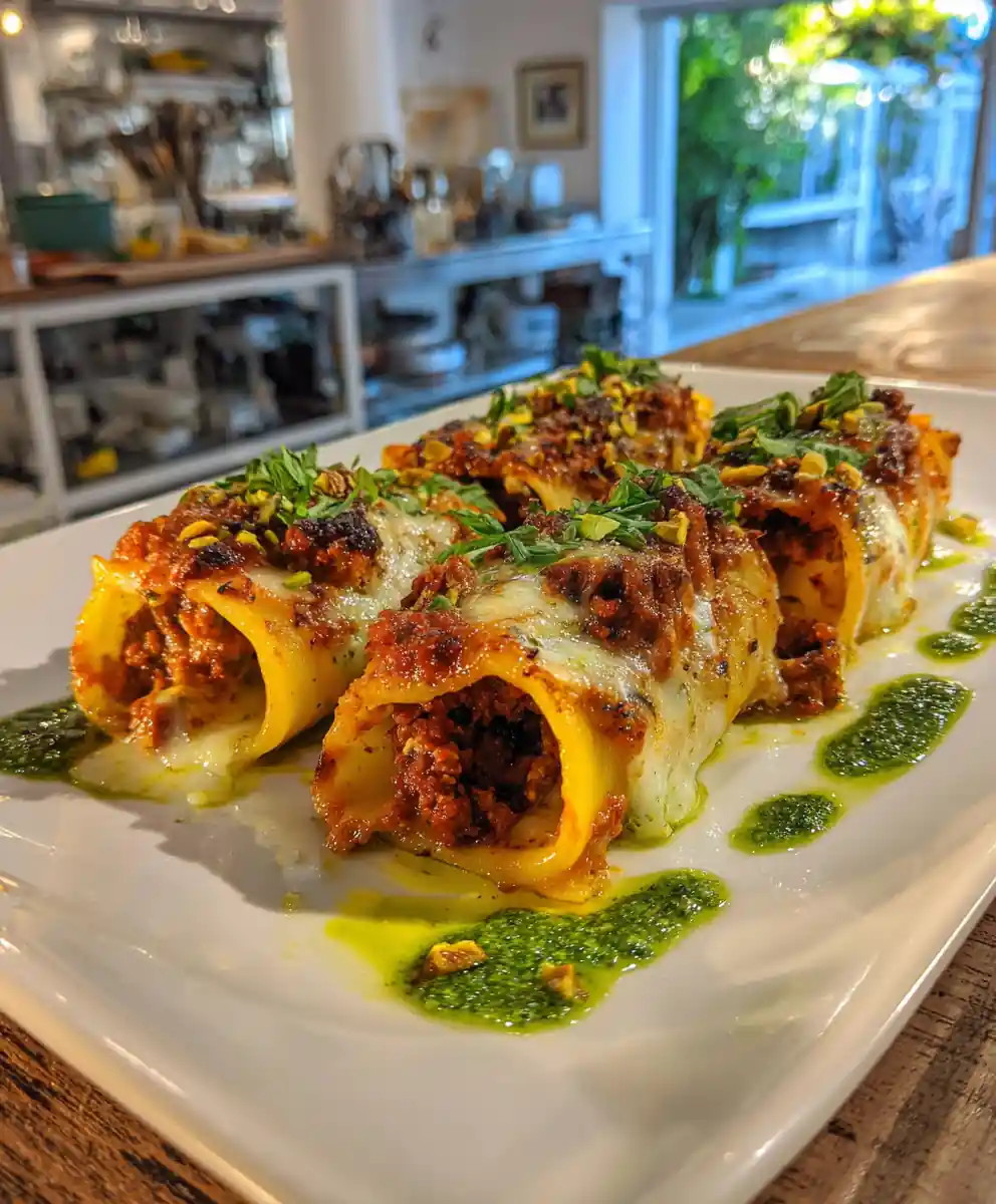 6. Assemble and Bake: Spread a thin layer of the remaining beef ragu on the bottom of a 22 x 30 cm (9 x 12 in) baking dish. Arrange the stuffed rigatoni in a single layer, seam-side up. Spoon the remaining bรฉchamel sauce over the top of the rigatoni, ensuring they are well covered. Sprinkle with the remaining mozzarella cheese and the rest of the grated Parmesan cheese. Create the pesto swirl by dropping teaspoon-sized dollops of the basil-pistachio pesto around the dish. Using a thin skewer or the tip of a knife, gently drag through each dollop to create elegant green ribbons. Bake uncovered for 25-30 minutes, or until the cheese is golden brown and bubbly, and the pesto ribbons are slightly crisped at the edges.