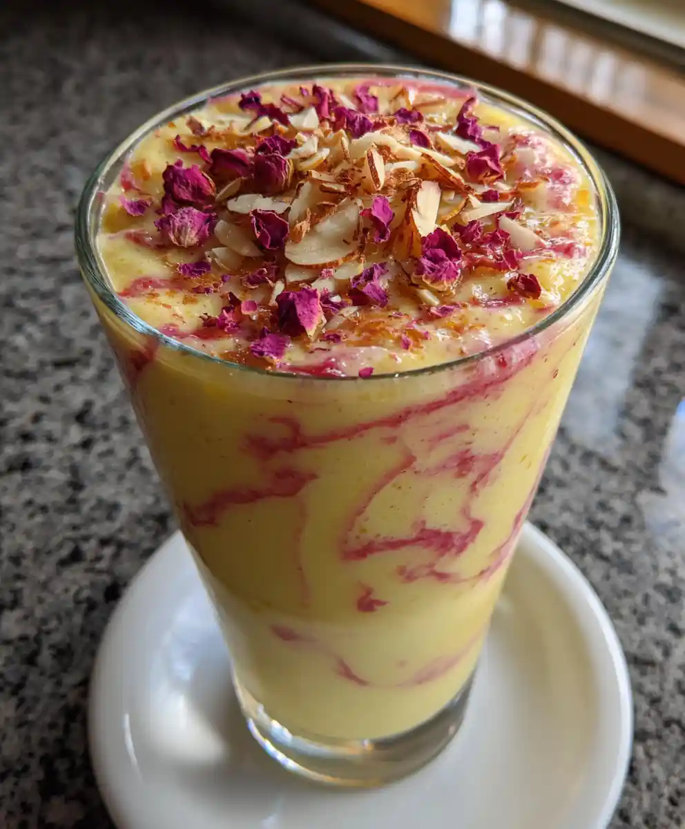 - Garnish & Serve: Top with almond slivers and rose petals; serve immediately.