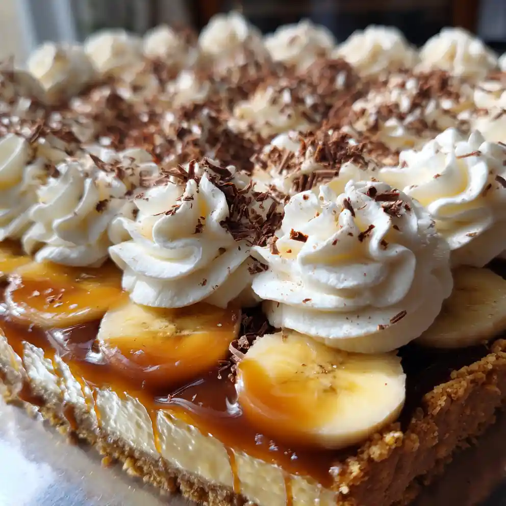 - Top The Pie: Gently spoon or pipe the whipped cream over the banana โgold tiles,โ creating a beautiful, fluffy topping for your banoffee pie. Garnish with chocolate shavings or cocoa powder if desired.