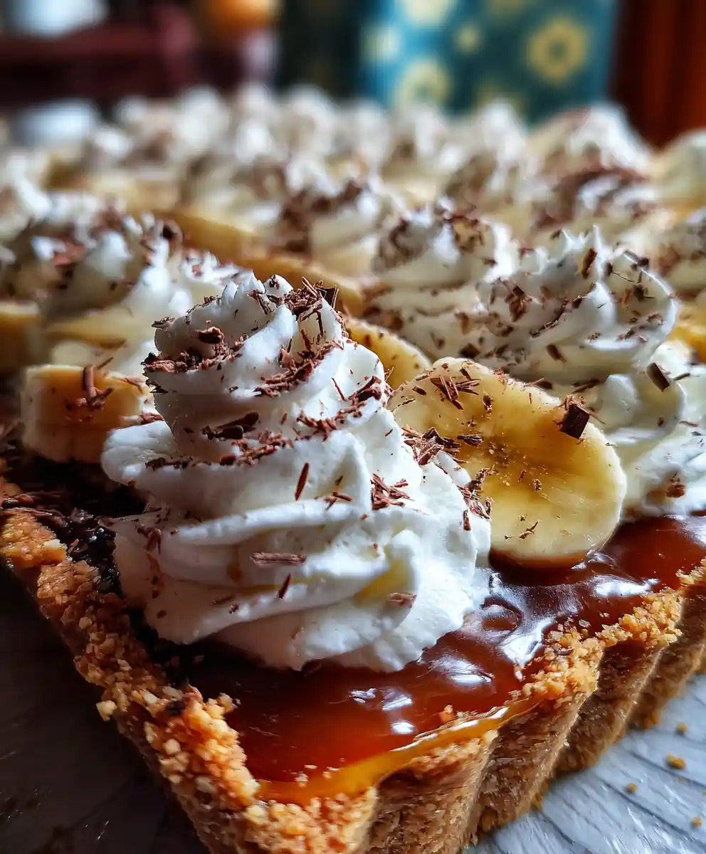 8. Top The Pie: Gently spoon or pipe the whipped cream over the banana โ€œgold tiles,โ€ creating a beautiful, fluffy topping for your banoffee pie. Garnish with chocolate shavings or cocoa powder if desired.