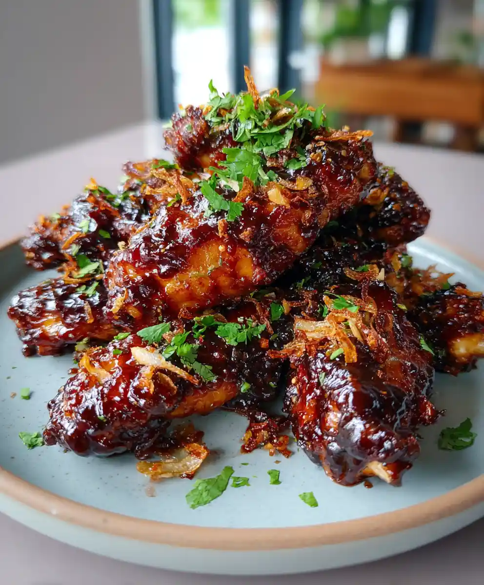 Finish with a generous scattering of the crispy shallots and a sprinkle of fresh cilantro for a final pop of color and freshness; this is the ultimate bbq chicken wings recipe.
