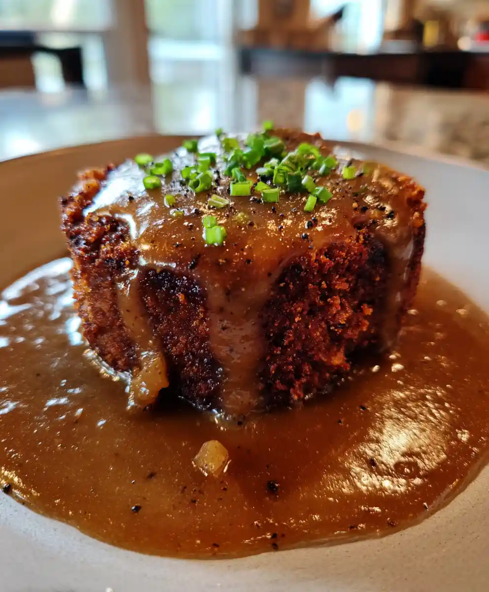 Place a golden-brown country fried steak on a plate. Spoon a generous amount of the rich Caramelized Onion & Black Pepper Gravy over the steak. Garnish with a sprinkle of finely chopped fresh chives and a final light dusting of coarse black pepper.