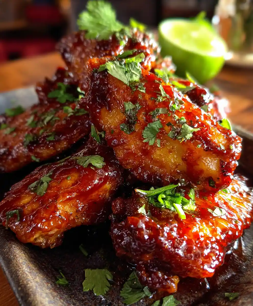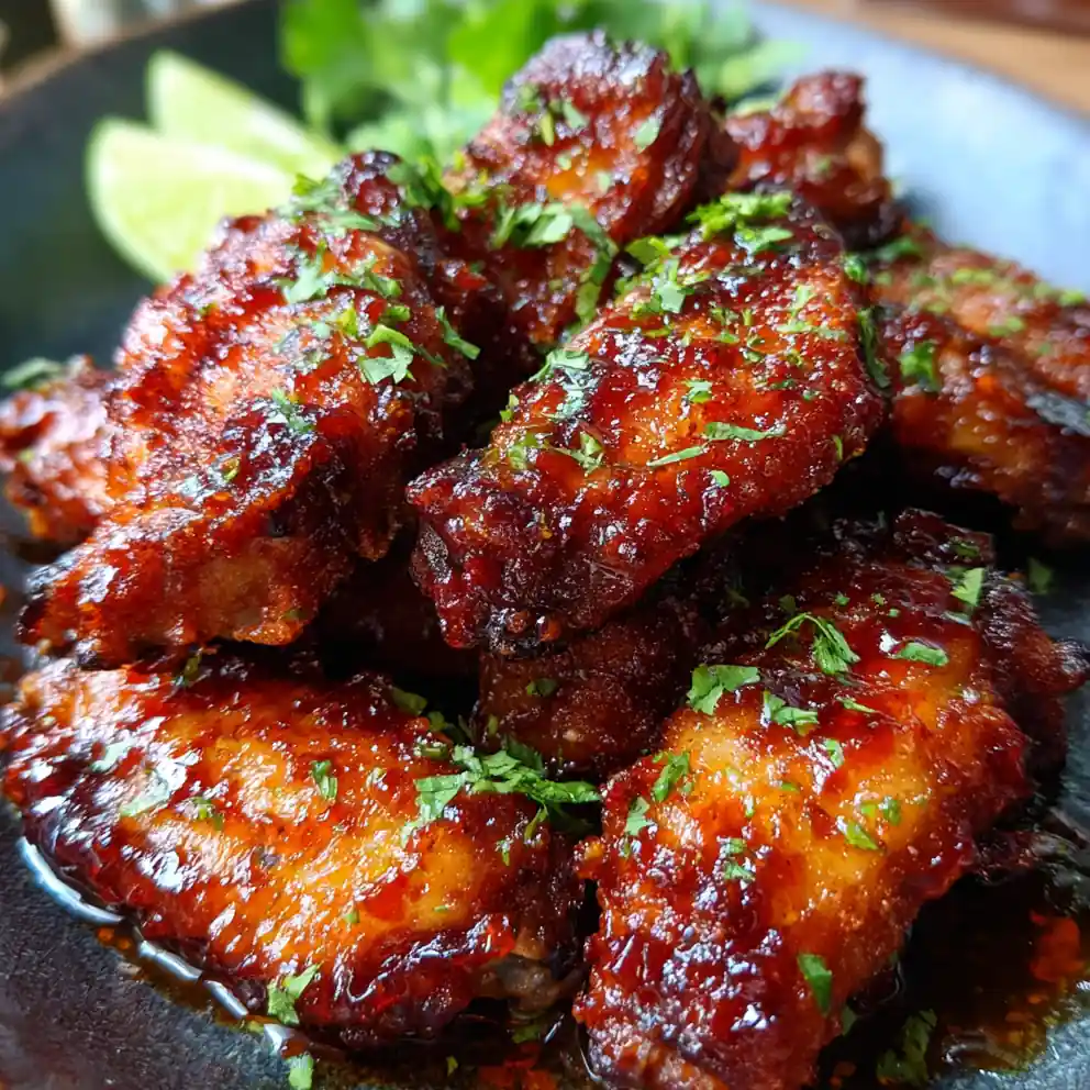 - Glaze and Serve: Immediately transfer the hot, crispy wings to a large mixing bowl. Pour the warm glaze over the wings and toss gently until every piece is coated. Garnish with fresh cilantro and lime wedges before serving immediately.