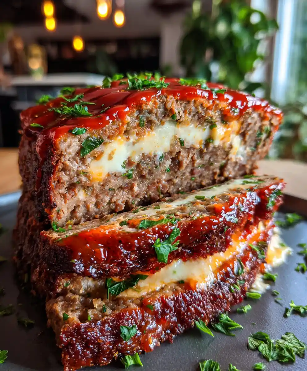 7. Rest Before Serving: Let the meatloaf rest on the baking sheet for 10-15 minutes before slicing. Garnish with fresh parsley before serving to display the creamy center.