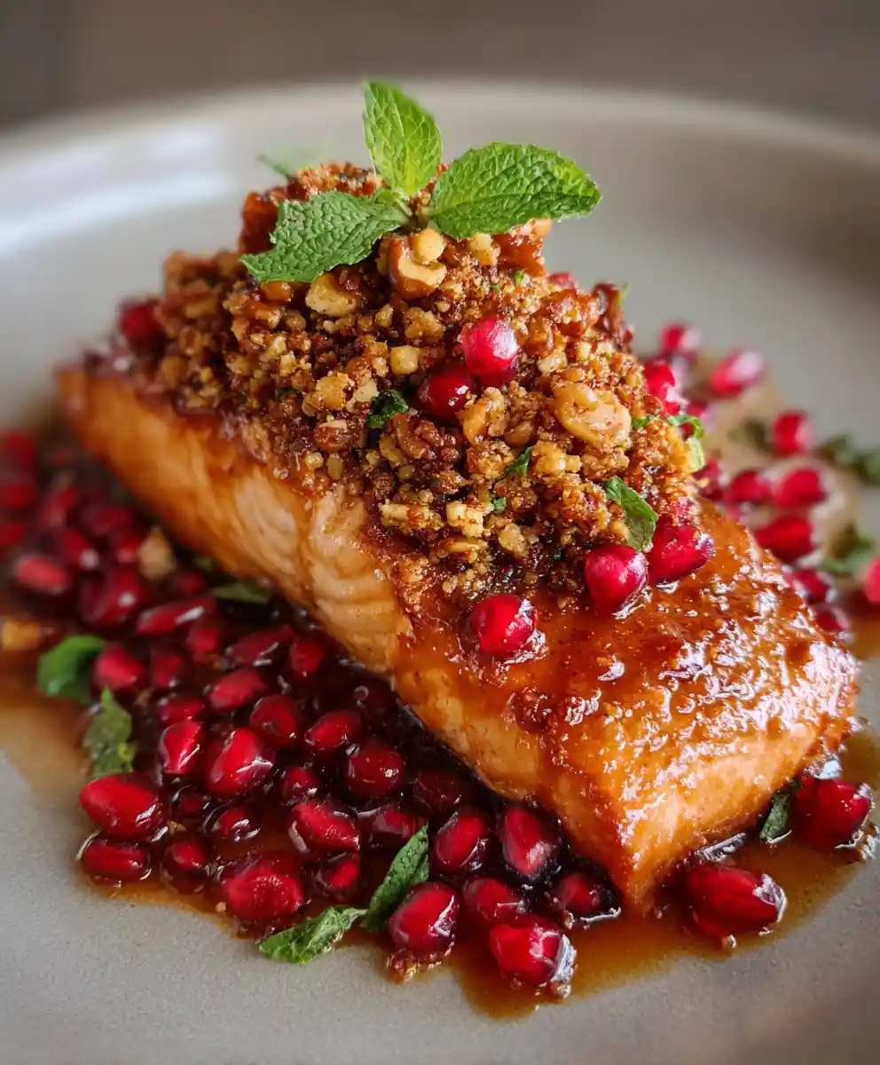 To plate, arrange each salmon fillet slightly off-center. Spoon a generous amount of the za’atar-walnut crumble over the top, allowing some to cascade gently. Scatter fresh pomegranate arils and chopped mint leaves around the salmon and over the crumble for vibrant color and fresh aroma. Serve immediately to enjoy this family-friendly best salmon recipe ever.