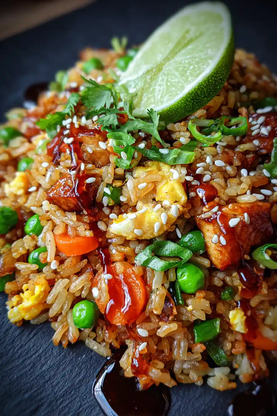 - Finish and Serve: Stir in the sliced spring onions and toasted sesame seeds. Give a final quick toss to distribute evenly. Remove from heat. Plate the fried rice, creating a neat mound. Drizzle a thin line of extra sesame oil in a spiral, place lime wedges on the side, sprinkle with chopped cilantro, and finish with a few more sesame seeds for visual appeal.