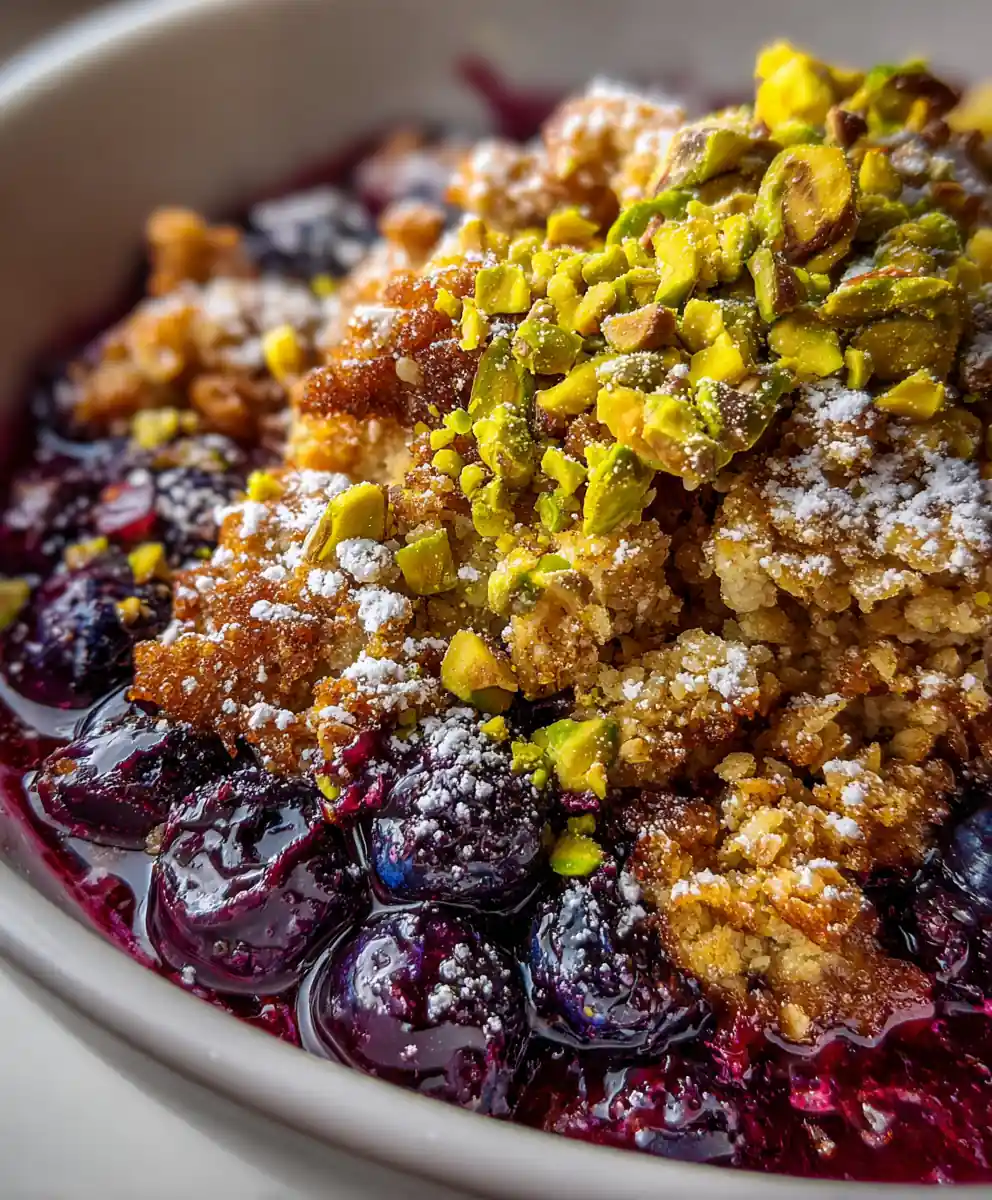 7. Serve and Enjoy: Scoop a generous portion of the warm blueberry crumble into a bowl. Lightly dust the top with 15 g (1 tablespoon) powdered sugar. Scatter the crushed pistachios and candied lemon zest over the dusted surface for color and texture.