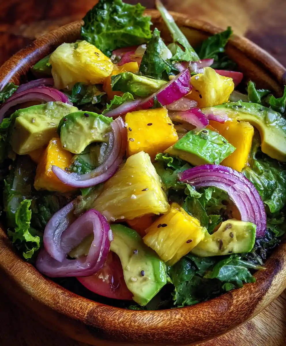 3. Assemble Vibrant Salad: In a large salad bowl, gently combine the mixed greens, diced pineapple, mango, kiwi, avocado, and red onion.