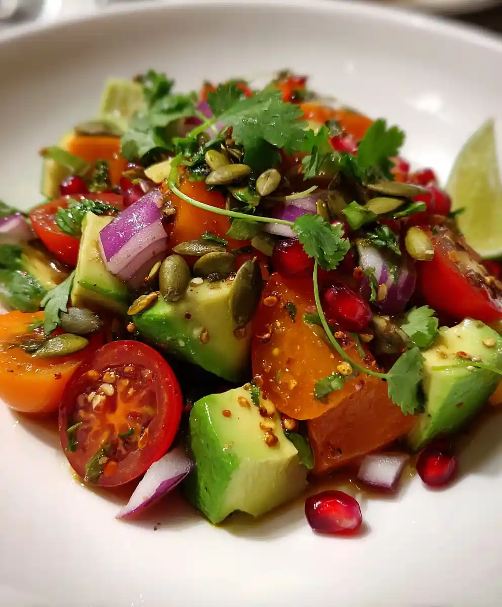 6. Plate and Garnish: Choose a visually appealing plate – white porcelain works particularly well. Mound the salad in the center of the plate. Drizzle any remaining vinaigrette around the edge in a thin, zig-zag pattern. Scatter the pomegranate arils and microgreens over the top for a burst of color and freshness. Finally, add a lime wedge to the side for a touch of visual contrast and an extra squeeze of citrus if desired.