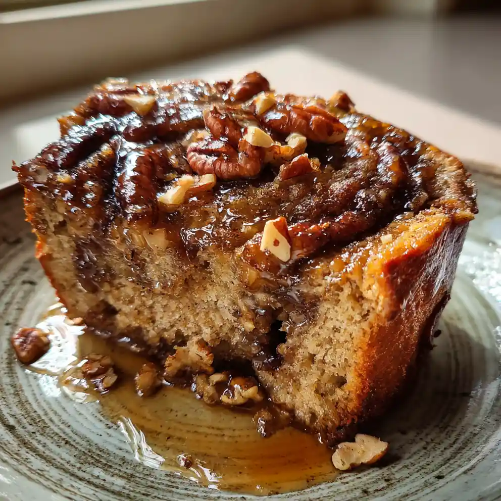 A rich, moist brown bread loaf featuring a gooey maple-pecan swirl and a sweet maple glaze, perfect for breakfast or a decadent snack.
