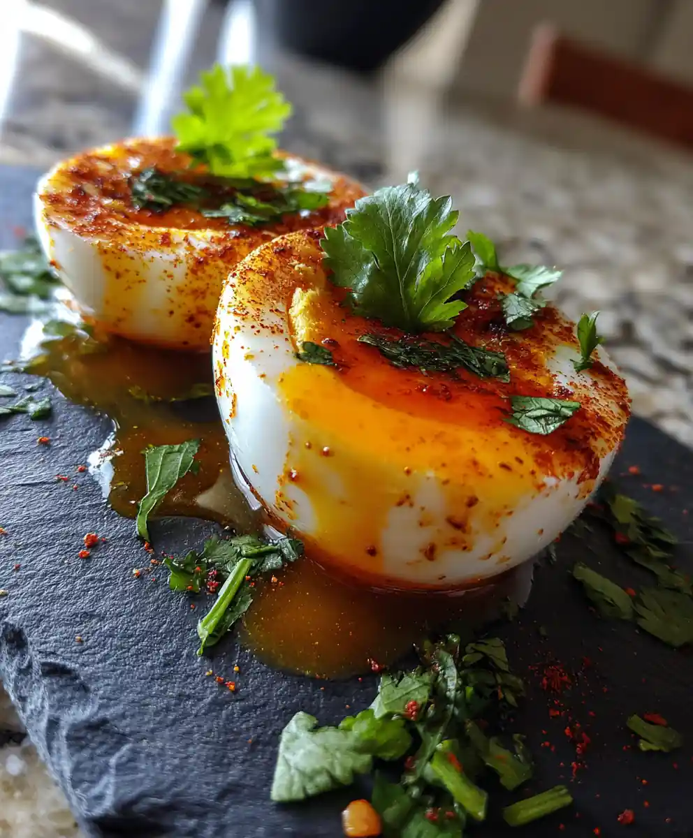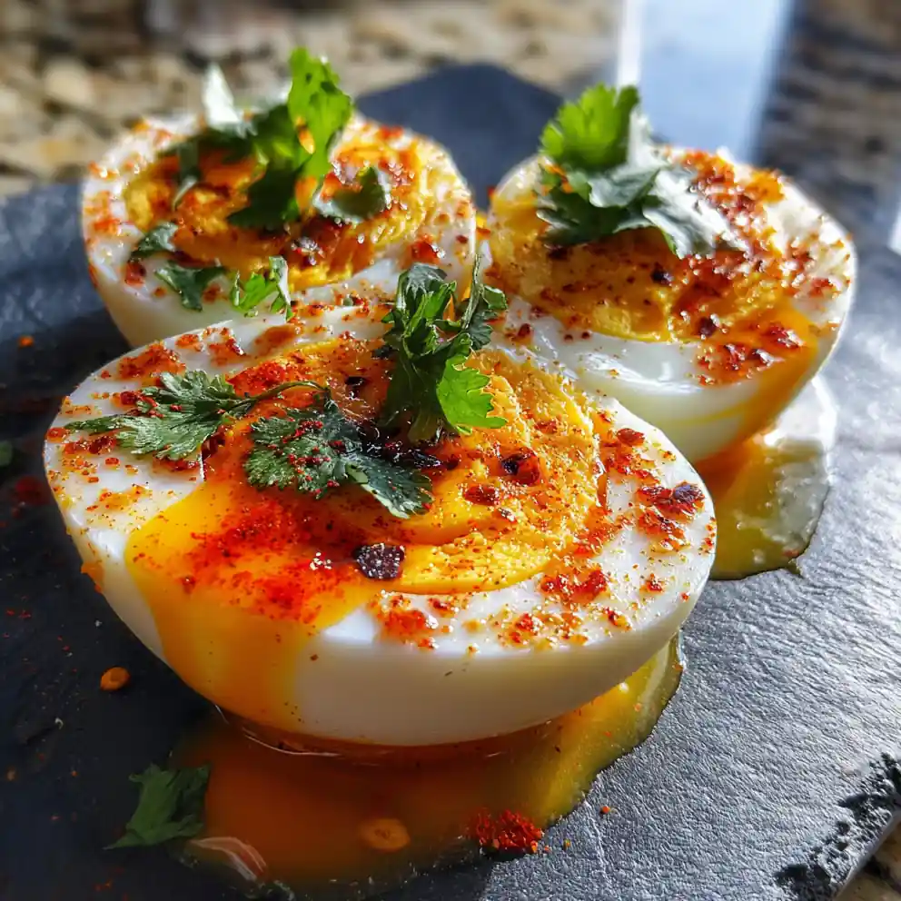 - Serve Immediately: Arrange the Cajun Boiled Eggs on a white plate in a single line or an appealing pattern. The contrast between the bright orange yolk, glossy butter drizzle, and green cilantro makes for a stunning presentation.