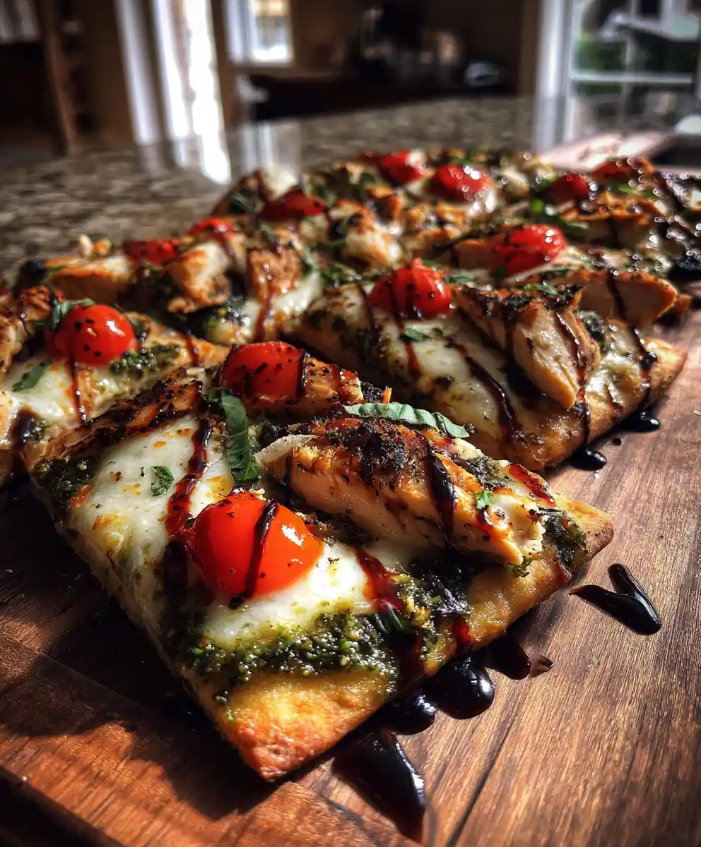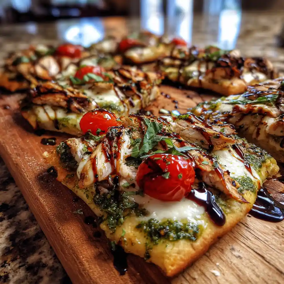 Looking for a weeknight dinner that feels a little bit special? This Charred Chicken Caprese Flatbread with Basil Pesto-Marbled Mozzarella is the answer! We’ve taken the classic Caprese salad โ fresh tomatoes, mozzarella, and basil โ and elevated it with smoky, charred chicken and a stunning pesto swirl. The balsamic glaze adds a touch of sweetness and tang, making each bite an explosion of Mediterranean flavors. This recipe is surprisingly easy to make, and the visual appeal is guaranteed to impress. Get ready to create a flatbread that’s as beautiful as it is delicious!