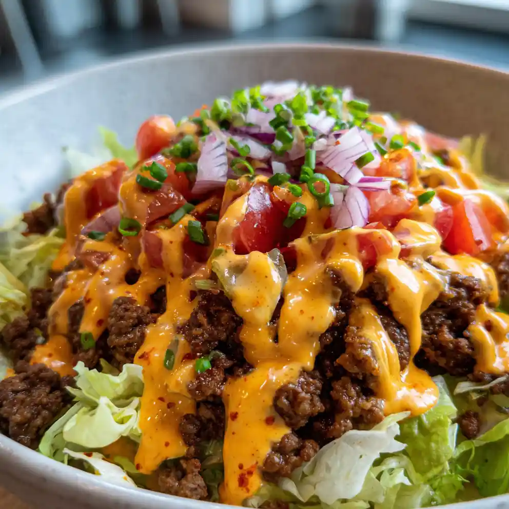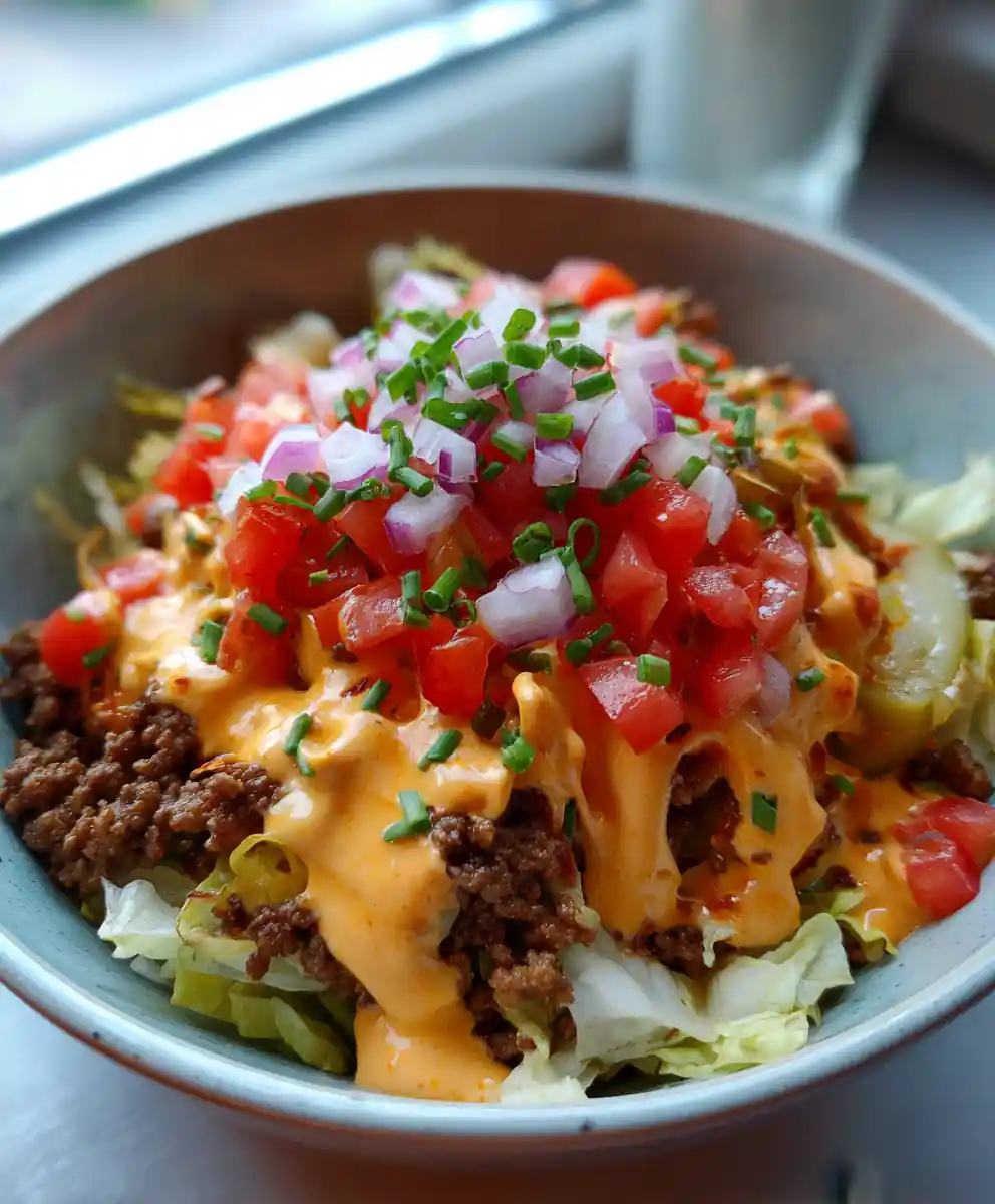 - Garnish and Serve: Finish with a sprinkle of diced red onion and chopped fresh chives over each cheeseburger bowl. Serve immediately while warm.