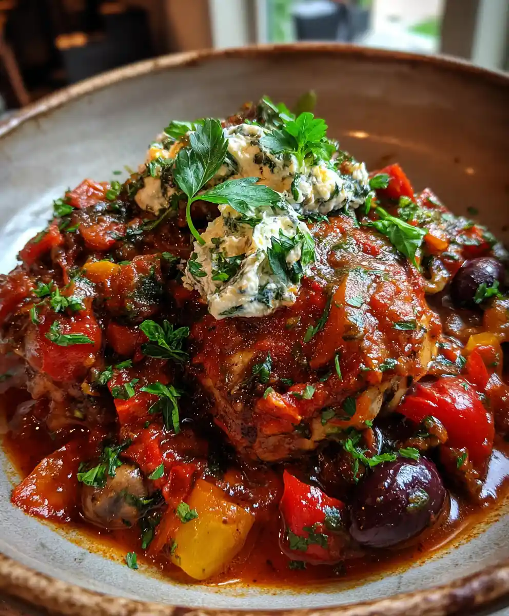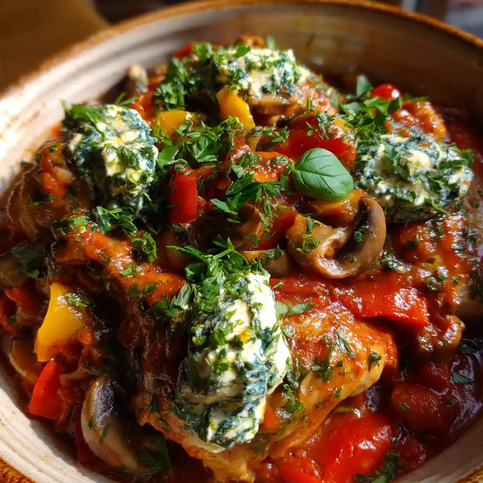 A hearty slow cooker recipe for Italian chicken cacciatore, featuring tender chicken in a savory sauce of tomatoes, peppers, and olives, finished with a creamy herb ricotta swirl.