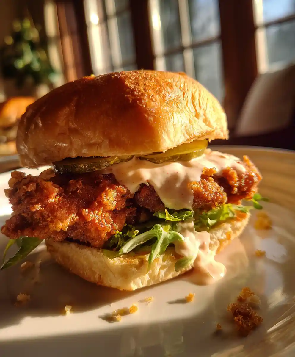 • Storing Leftovers: Store leftover crispy chicken in an airtight container in the refrigerator for up to 3 days. Reheat in an air fryer or oven (400ยฐF/200ยฐC) until crispy again. Do not store the fully assembled sandwich, as the bun and toppings will become soggy.