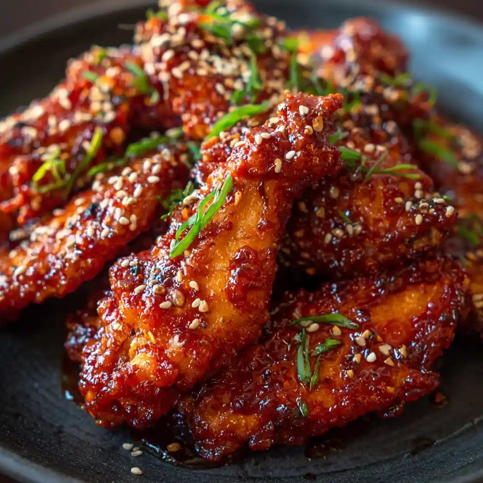 5. Coat and Serve: Transfer the cooked, crispy wings to a large bowl. Pour the prepared gochujang honey glaze over the wings and toss vigorously until every piece is coated. Garnish with sesame seeds and scallions before serving.