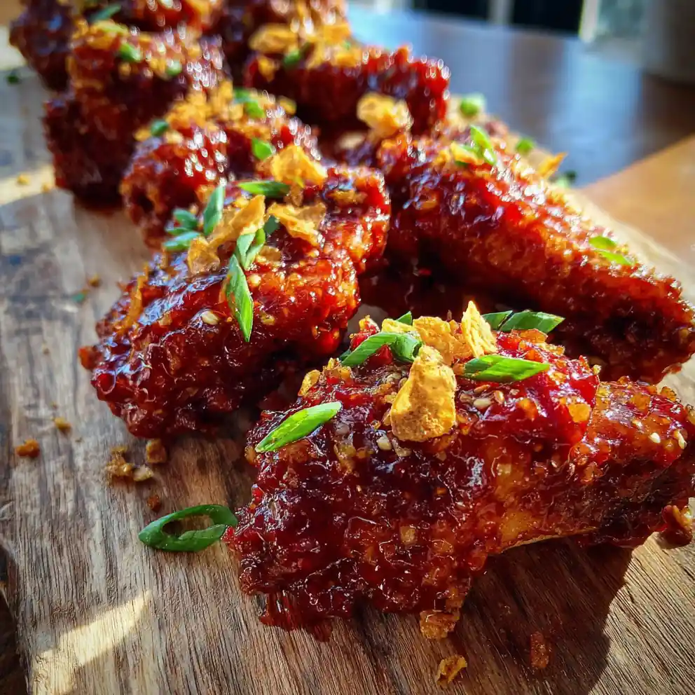 6. Toss and Serve: In a large bowl, add the hot crispy chicken wings. Pour the warm Gochujang glaze over them and toss thoroughly until every wing piece is evenly coated. Arrange on a platter and sprinkle generously with the crispy garlic and scallion topping before serving immediately.