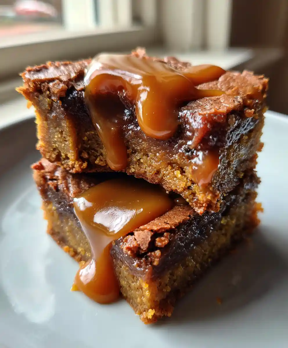 - Bake and Cool: Bake for 25-30 minutes, or until the edges are golden brown and a toothpick comes out with moist crumbs. Let the blondies cool completely in the pan for at least 2 hours to set before cutting. Garnish with reserved caramel and extra cardamom before serving.