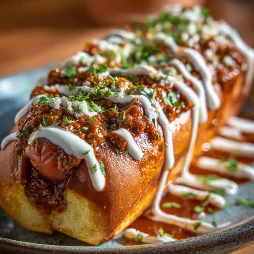 - Assemble Chili Dogs: Place a hot dog in each toasted bun. Spoon generous amounts of warm adobo beef chili over the hot dogs. Drizzle with lime crema and garnish with fresh cilantro before serving immediately.