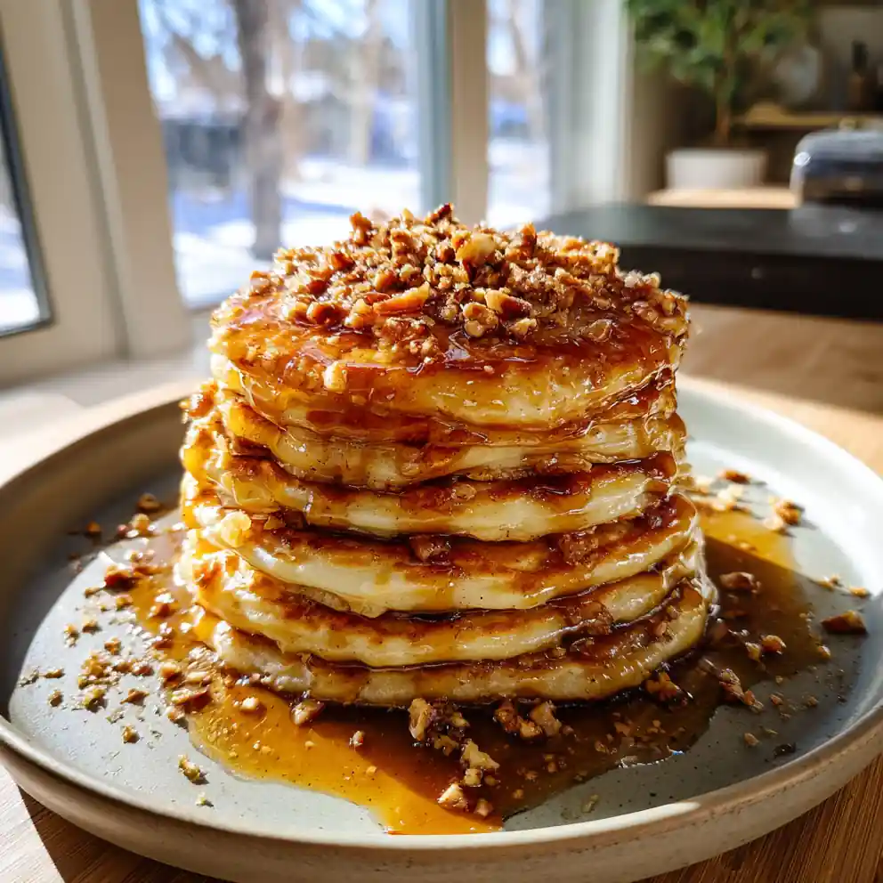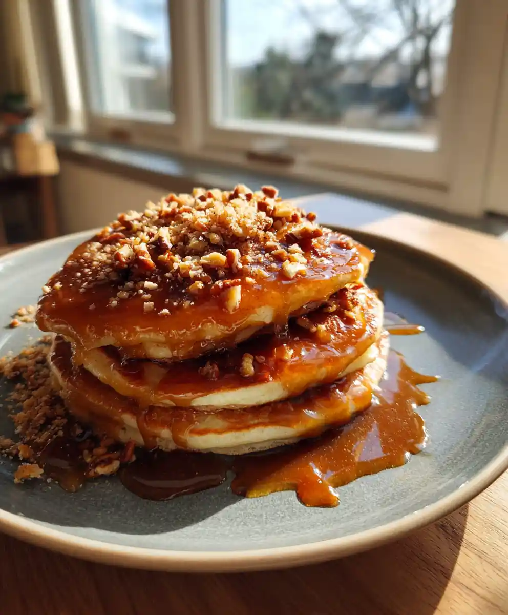 11. Plate and Garnish: Stack two or three pancakes on a plate. Drizzle generously with warm caramel maple sauce, sprinkle with toasted pecan crumbs, and finish with a thin drizzle of pure maple syrup. A light dusting of cinnamon is optional but adds a lovely aroma and flavor.