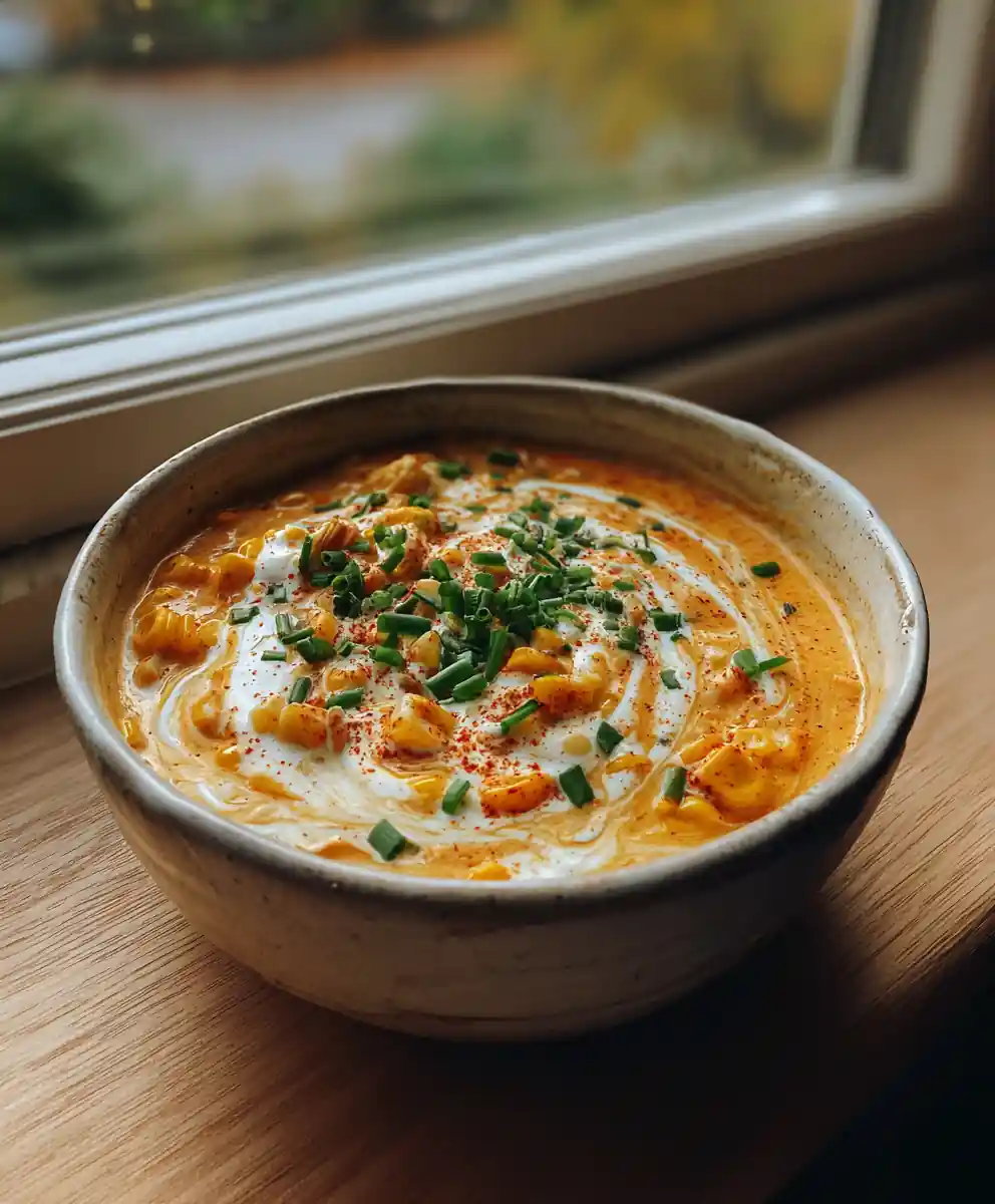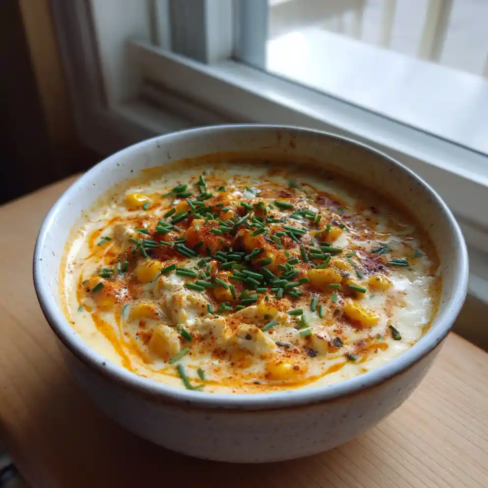 9. Assemble and Serve: Ladle the creamy buffalo chicken soup into bowls. Top each bowl with a spoonful of the charred corn. Drizzle the warm smoked cheddar cream in a circular motion over the soup to create beautiful ribbons. Garnish with a scattering of fresh chives and a pinch of smoked paprika for a pop of color. Serve immediately.