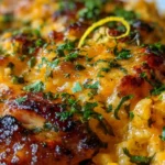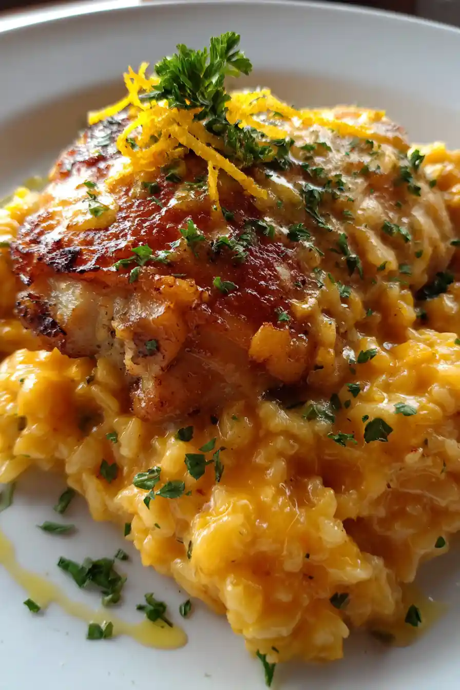 - Rest and Serve: Remove the pot from the heat and let the dish rest, covered, for 5 minutes. This allows the flavors to meld together and the rice to finish steaming. To serve, spoon a generous portion of the creamy rice into a wide bowl, top with a chicken thigh, drizzle with herb-infused olive oil, and garnish with chopped parsley and a few extra lemon zest curls.