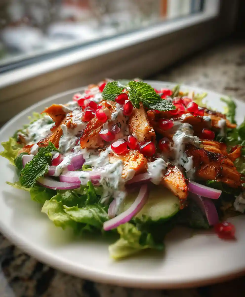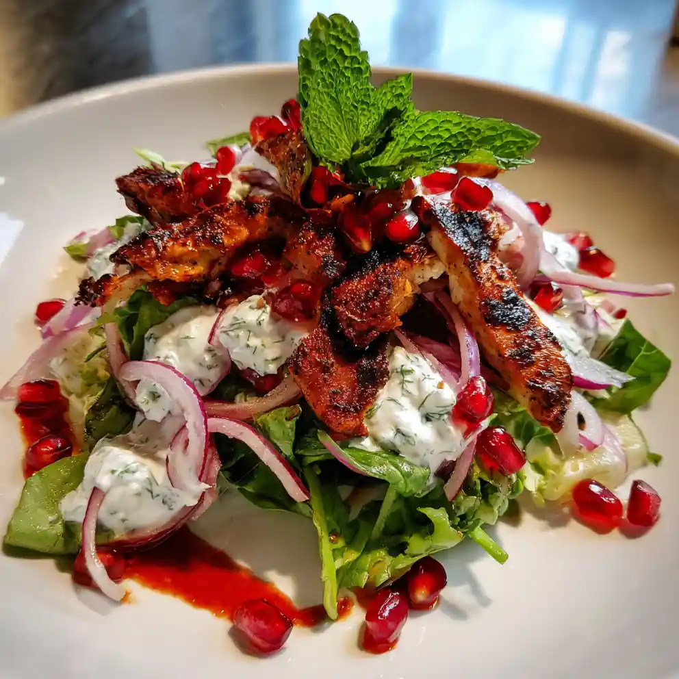 Looking for a vibrant and flavorful salad that’s both satisfying and healthy? This Creamy Tzatziki Chicken Salad with Pomegranate Molasses Drizzle is a delightful fusion of Greek and Middle Eastern flavors. Tender, seared chicken is paired with a cool and refreshing tzatziki sauce, brightened by a tangy pomegranate molasses dressing, and finished with a sprinkle of fresh herbs and juicy pomegranate seeds. It’s a salad that’s as beautiful to look at as it is delicious to eat โ perfect for a light lunch, a summer dinner, or even a stunning side dish. Get ready to experience a burst of freshness and flavor in every bite!