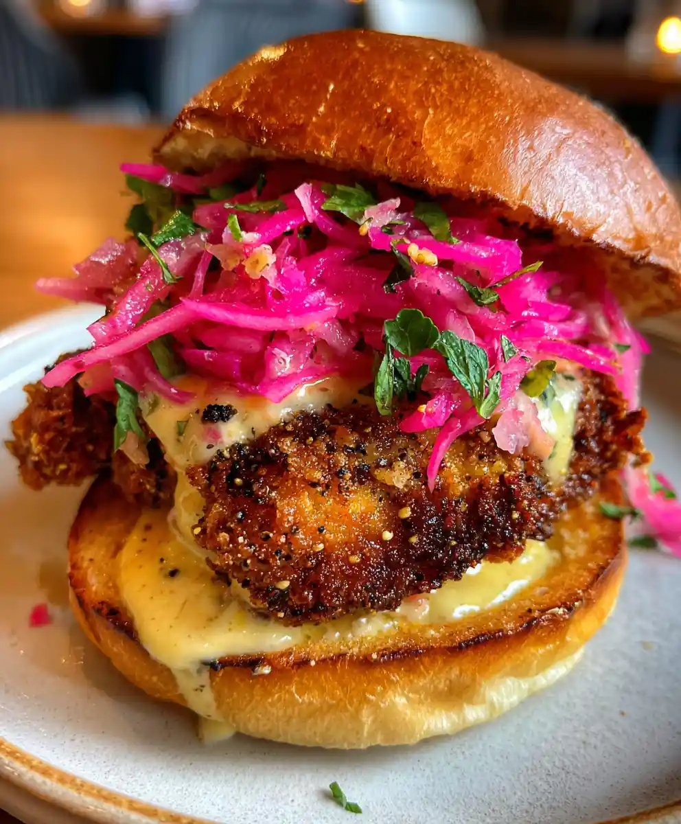 This recipe provides a guide for making a crispy chicken sandwich at home, offering a healthier and hearty alternative to takeout. It features golden-brown fried chicken, a zesty Lemon-Tahini Drizzle, and a vibrant Pink Pickled Turnip Slaw, perfect for a family-friendly weeknight meal.