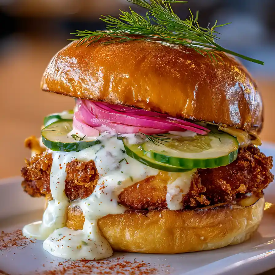 - Assemble the Masterpiece: Spread a generous spoonful of the chilled aioli on the bottom half of each toasted bun. Place a crispy fried chicken breast on top of the aioli. Add a layer of thinly sliced cucumber pickles and quick-pickled red onion. Garnish with a fresh sprig of dill. Cap with the top bun.
