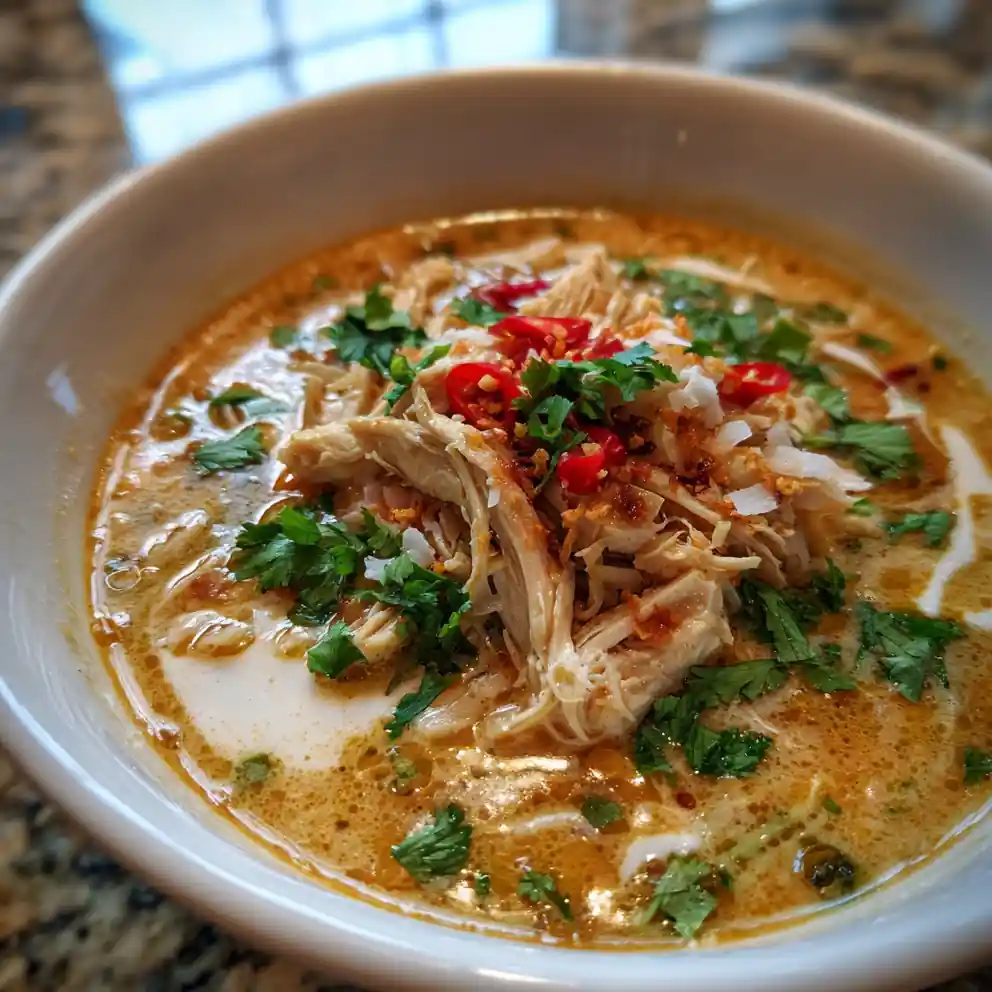- Serve & Garnish: Ladle soup, swirl in coconut cream, and garnish with coconut flakes, cilantro, and chili.