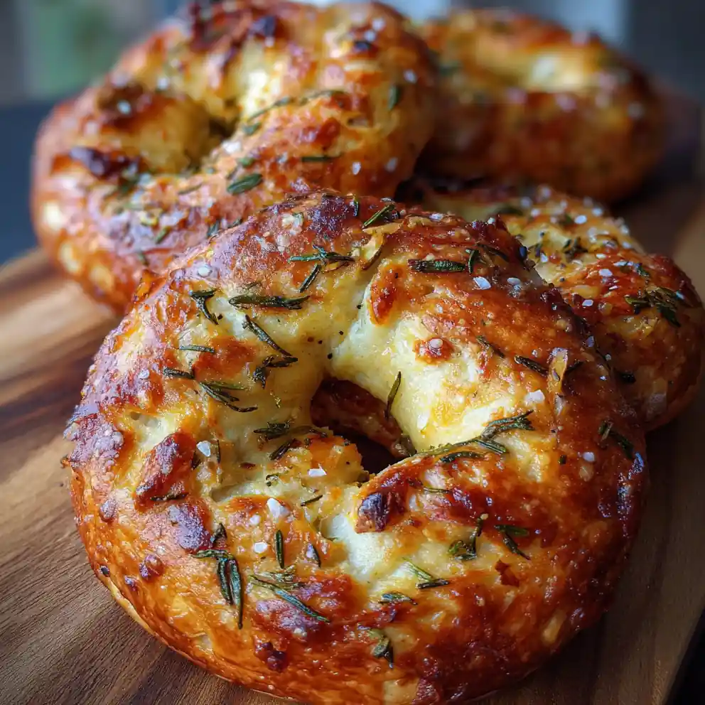 This quick bagel recipe uses Greek yogurt and baking powder instead of yeast, resulting in a chewy texture in less than an hour. The high-protein bagels are infused with roasted garlic and rosemary for a savory flavor, perfect for a fast breakfast or snack.