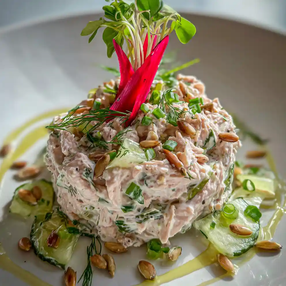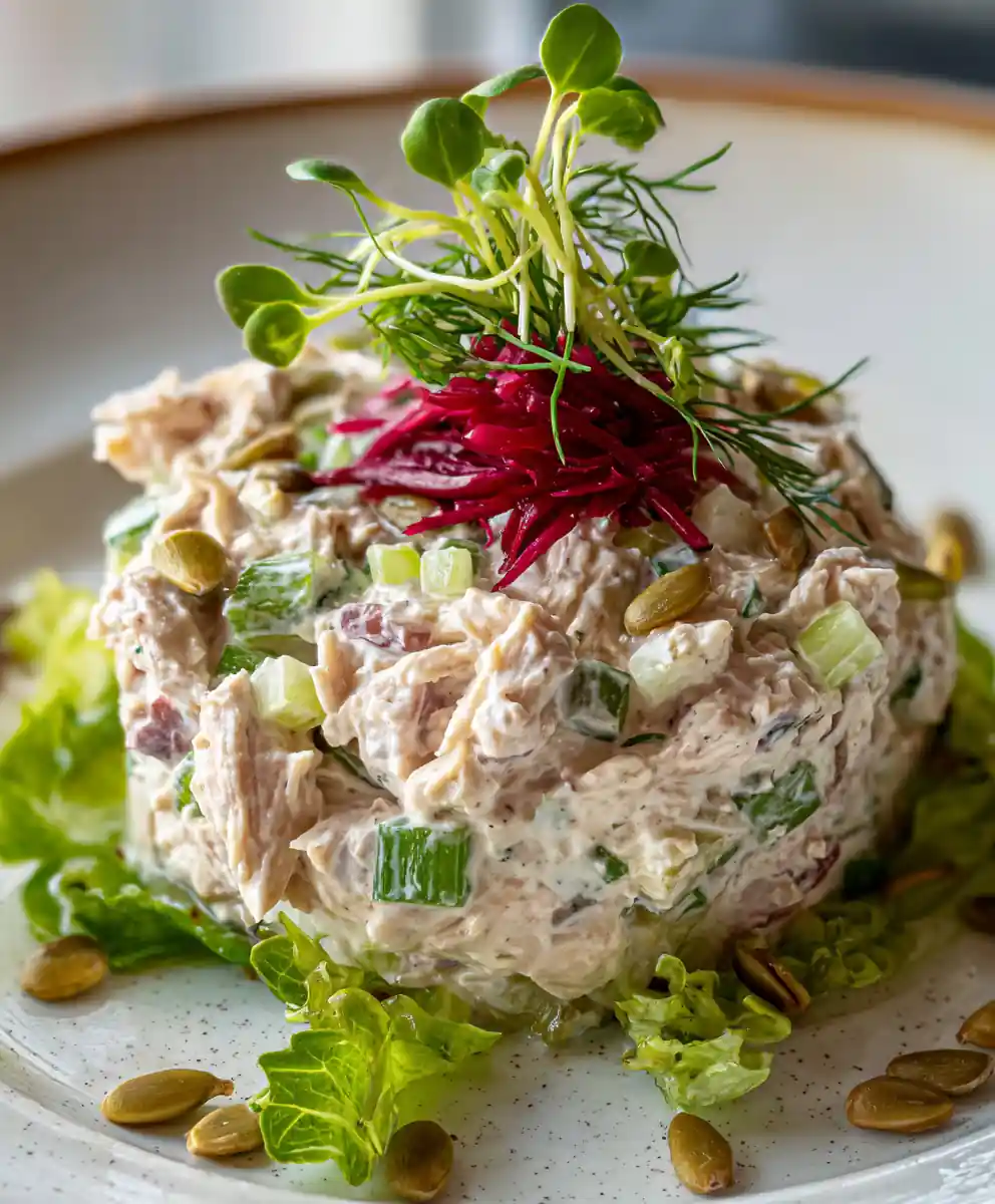 - Plate and Garnish: Transfer the chicken salad to a serving plate and shape it into a neat mound. A shallow well in the center can hold a drizzle of vinaigrette (optional). Garnish generously with the remaining fresh dill, chopped chives, and extra sunflower seeds. For a visually appealing presentation, insert dill pickle spears vertically along one side and add a sprig of microgreens.