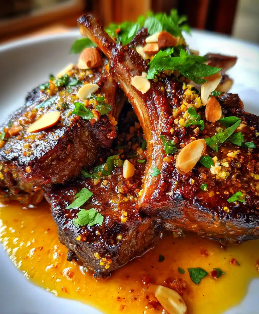 - Finish and Serve: Return the rested lamb chops to the skillet and gently turn them to coat evenly in the glaze. Warm through for about 30 seconds per side, then transfer the chops to serving plates. Spoon any remaining glaze over the chops and sprinkle generously with toasted almonds and fresh parsley.