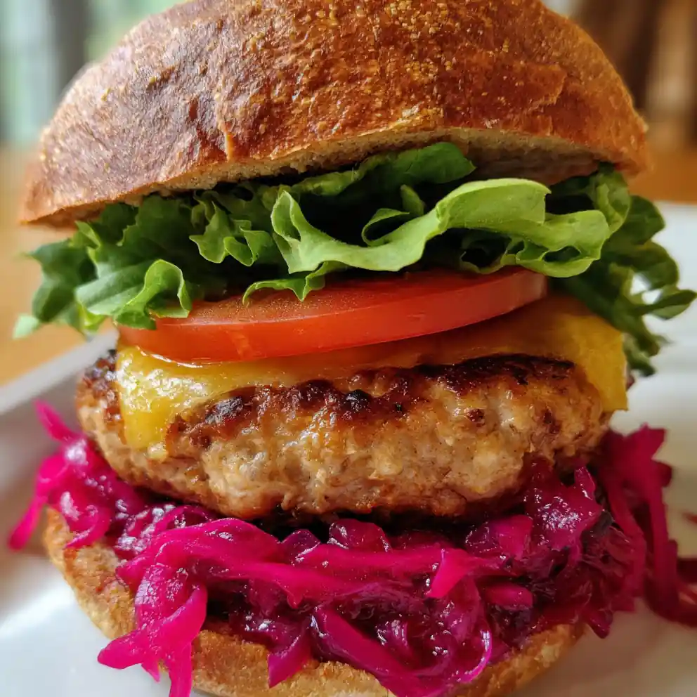 This easy turkey burger recipe with vibrant beet pickled onions is a healthy, family-friendly meal. It features juicy, seasoned turkey patties, crisp lettuce, tomato, and tangy homemade beet and red onion pickles on whole wheat buns.