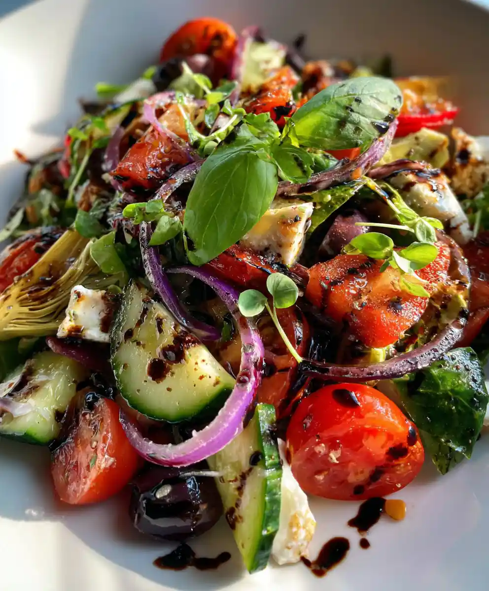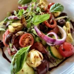 - Garnish and Serve: Drizzle the balsamic reduction in a thin, zig-zag pattern across the top of the salad. This adds a touch of sweetness and a beautiful glossy finish. Scatter torn fresh basil leaves and a handful of microgreens over the salad for added color, freshness, and a burst of flavor. Finish with a light crack of black pepper and an extra pinch of salt if needed. Serve immediately on a white ceramic plate to make the colors pop.