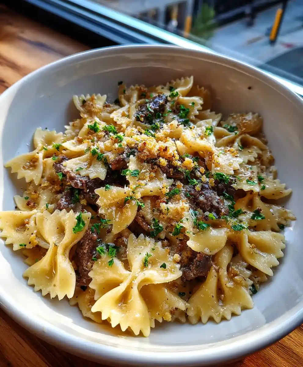 This Garlic-Butter Bowtie Pasta combines tender beef sirloin, a luscious garlic-butter sauce, and a crunchy walnut-ginger crumble for a flavorful and satisfying meal. It’s surprisingly easy to make and perfect for any occasion.