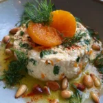 - Serve: To serve, arrange 1-2 chilled gefilte fish patties on a plate. Top each patty with a chilled carrot round and a small spoonful of the jellied broth. Scatter a few toasted pine nuts around and over the fish. Garnish with fresh dill and cilantro sprigs for a pop of vibrant green. Finish with a delicate drizzle or small swirl of the bright orange harissa-infused olive oil for color contrast and a hint of warmth, completing this beautiful gefilte fish recipe.
