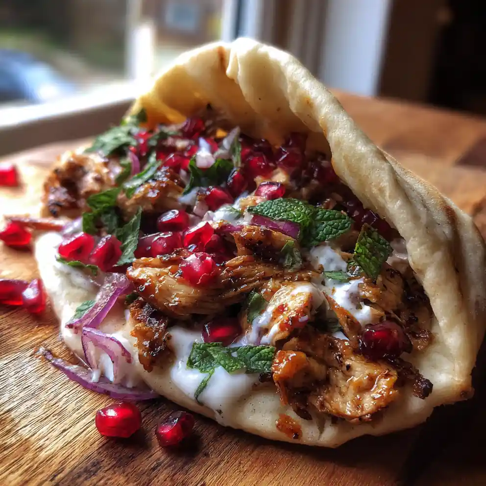 8. Assemble Gyros: Spread tzatziki on pita, top with chicken, pomegranate seeds, and mint.