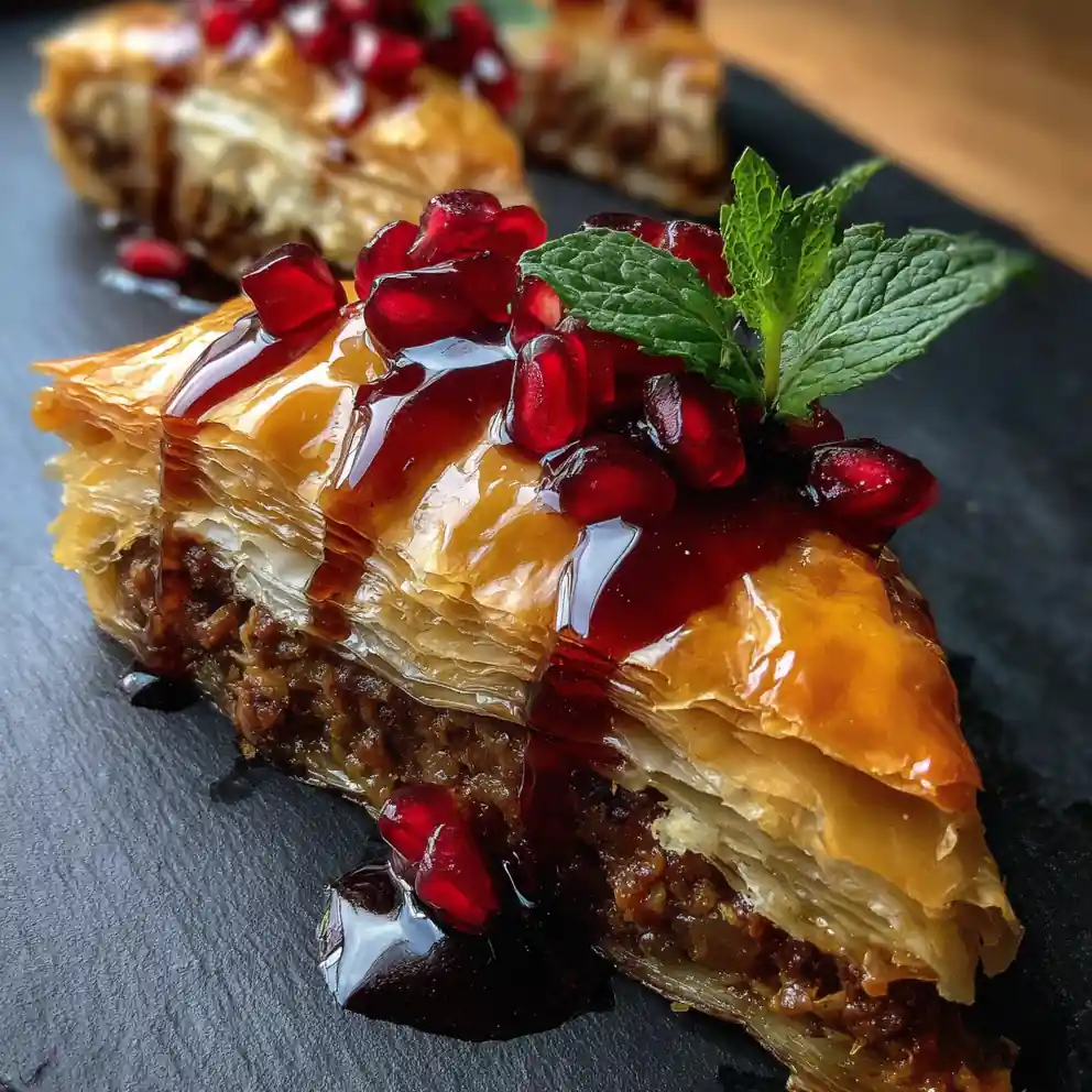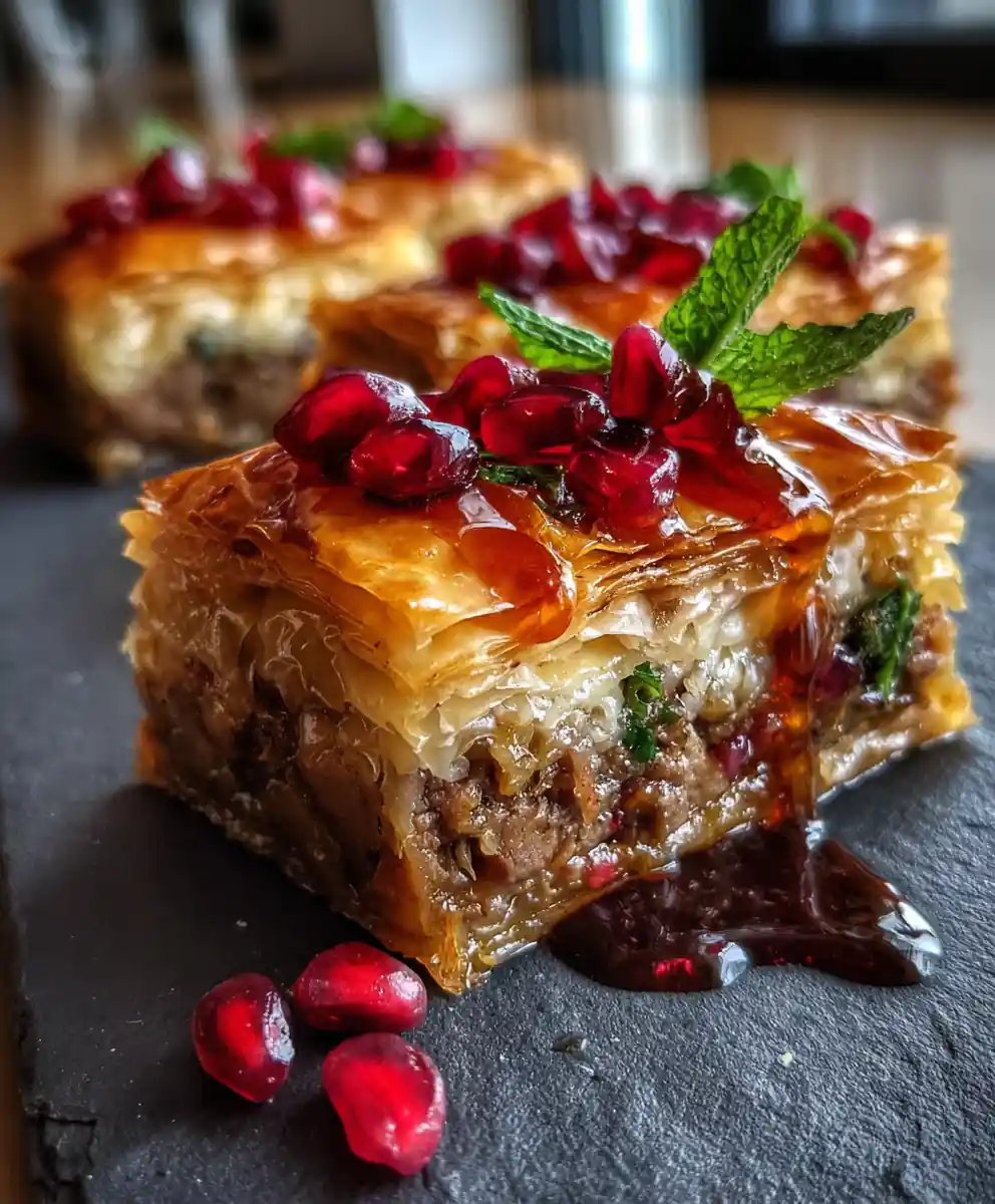 - Add Remaining Filling and Glaze (Layer 2): Add the remaining lamb mixture, drizzle the rest of the pomegranate glaze, and finish with the final 4 phyllo sheets, brushing the top layer generously with melted butter or olive oil.