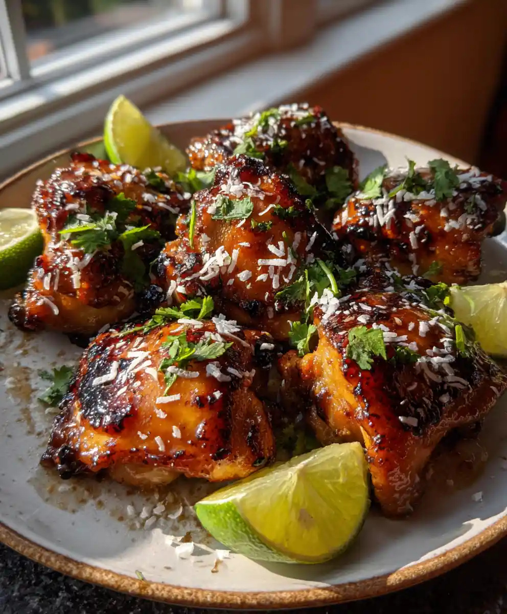 - Serve: Transfer the grilled chicken thighs to a serving platter. Drizzle generously with the thickened coconut-lime glaze and sprinkle with the remaining toasted coconut flakes. Garnish with fresh cilantro leaves and serve immediately with lime wedges for squeezing. Steamed rice or grilled pineapple make excellent accompaniments.