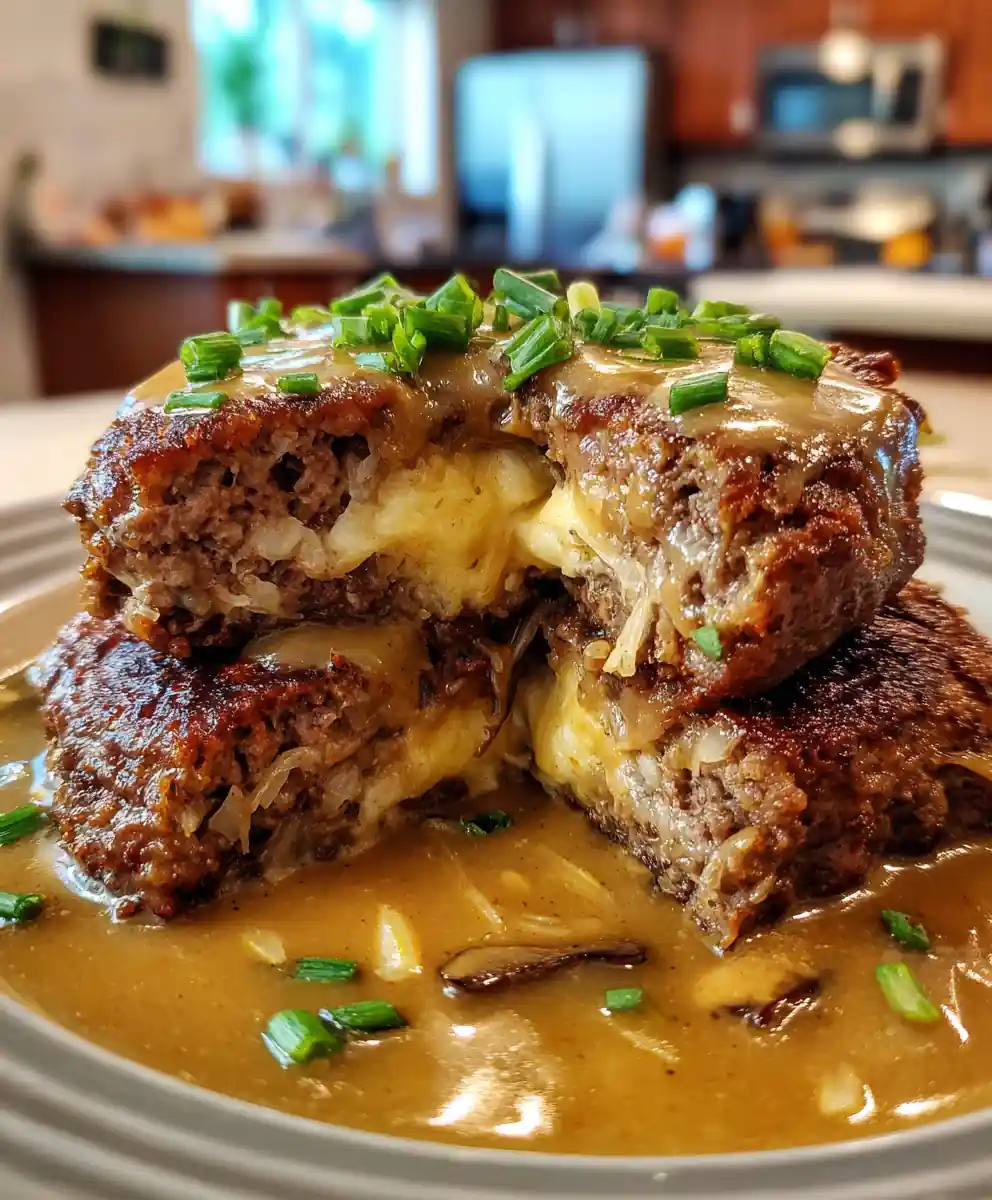 This recipe elevates classic hamburger steak by stuffing beef patties with a creamy filling of caramelized onions, roasted garlic, and cream cheese, served with a rich mushroom gravy.