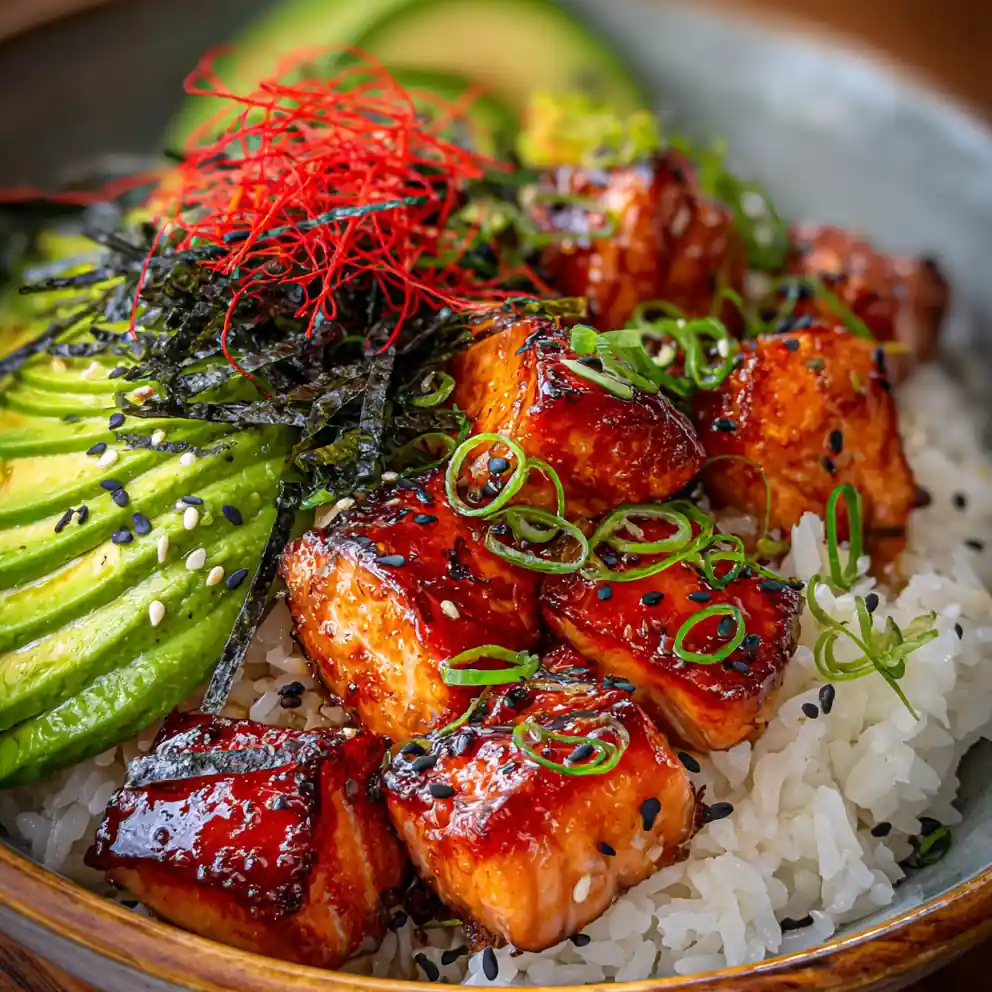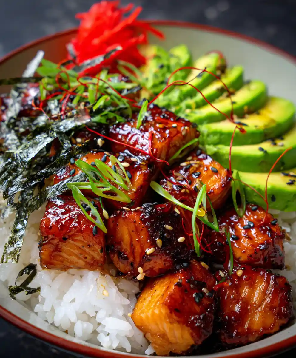 - Assemble Bowl: Spoon rice into a bowl, top with salmon, and drizzle with sauce.