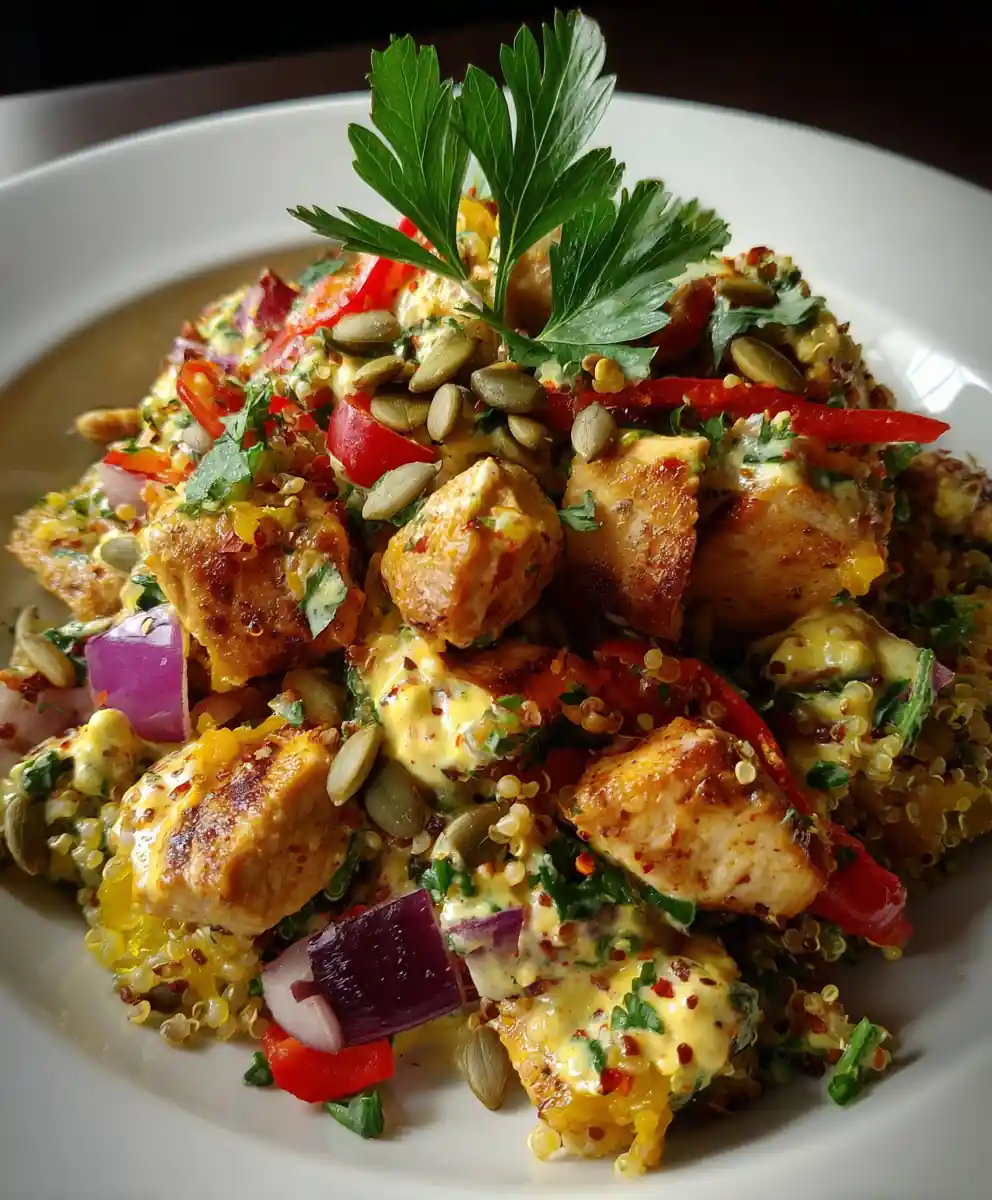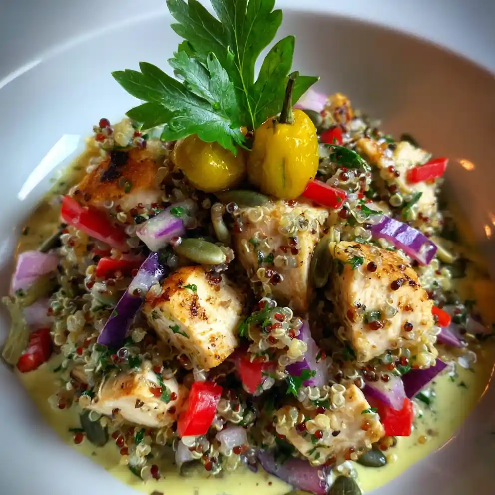 - Combine the Salad Ingredients: In a large mixing bowl, combine the diced grilled chicken, cooked quinoa, sliced pepperoncini, diced red bell pepper, chopped red onion, toasted pumpkin seeds, and chopped parsley.